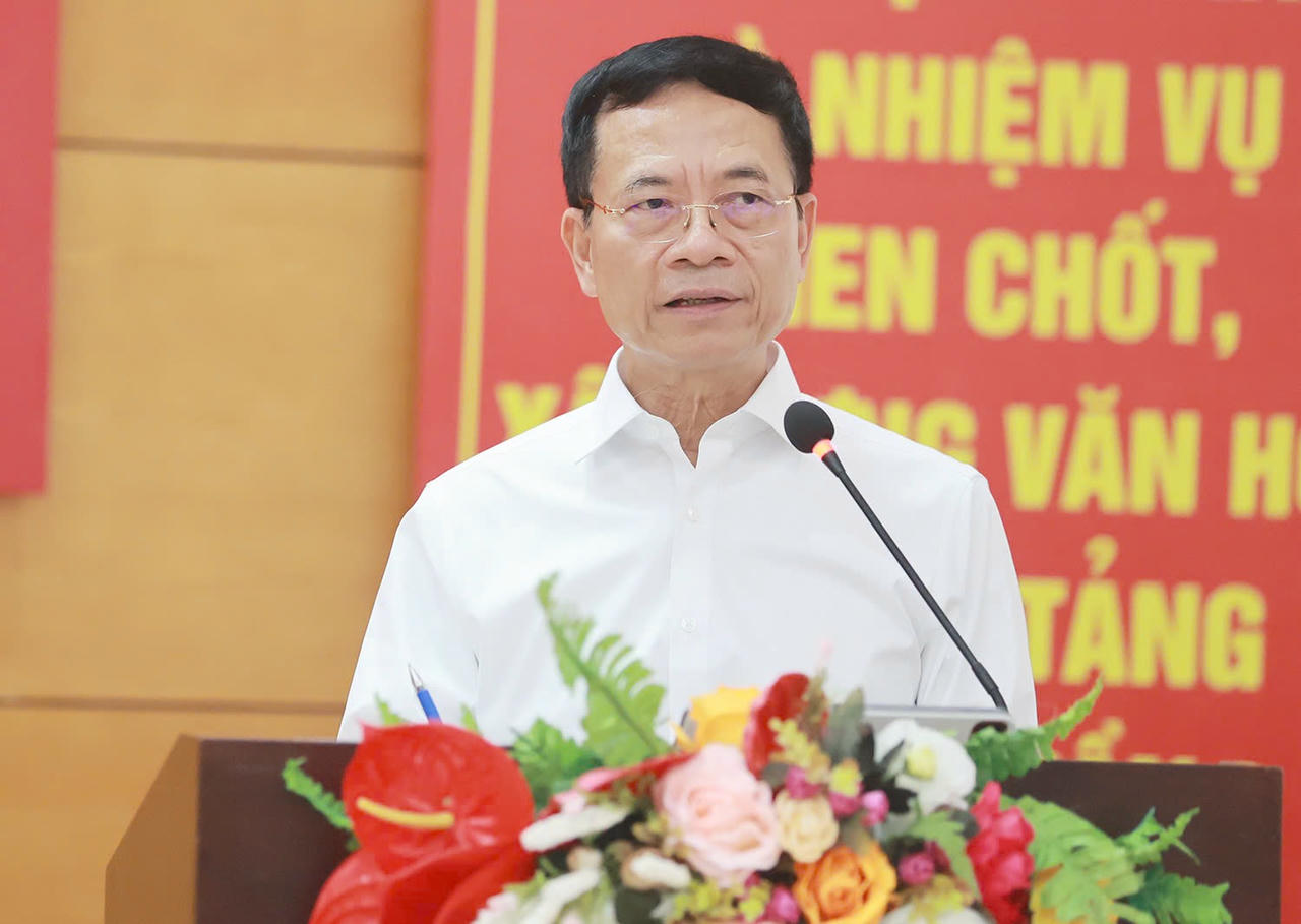 | Bộ trưởng Bộ Thông tin và Truyền thông Nguyễn Mạnh Hùng phát biểu tại buổi làm việc |