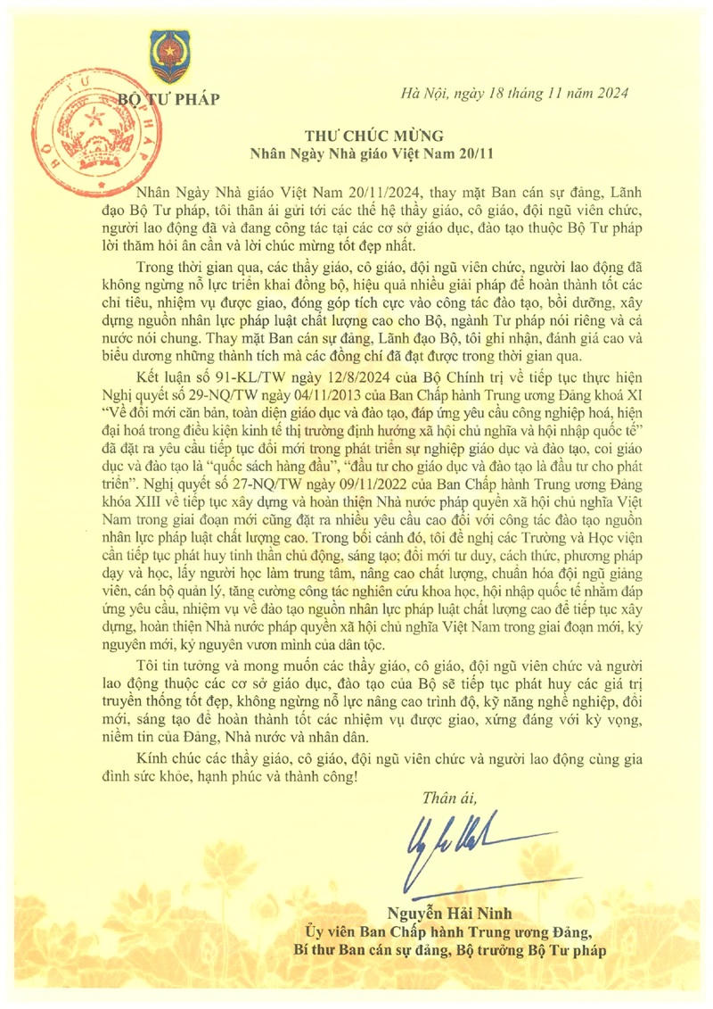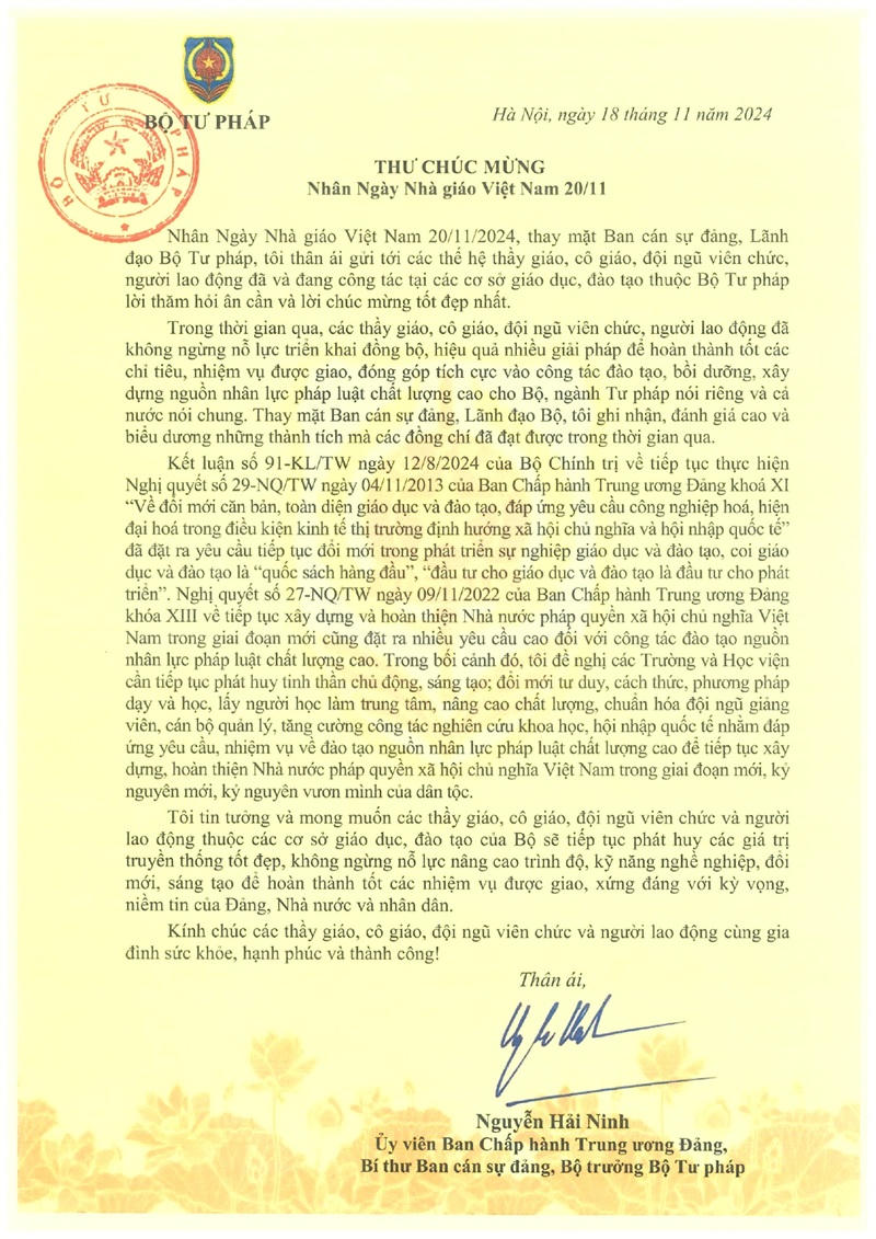 (PLVN) -Nhân ngày Nhà giáo Việt Nam 20/11/2024, Ủy viên Ban chấp hành Trung ương Đảng, Bí thư Ban cán sự đảng, Bộ trưởng Bộ Tư pháp Nguyễn Hải Ninh đã có thư chúc mừng gửi đến các thầy giáo, cô giáo cùng toàn thể viên chức, người lao động trong các cơ sở giáo dục, đào tạo thuộc Bộ Tư pháp. Báo Pháp luật Việt Nam trân trọng giới thiệu thư Bộ trưởng.