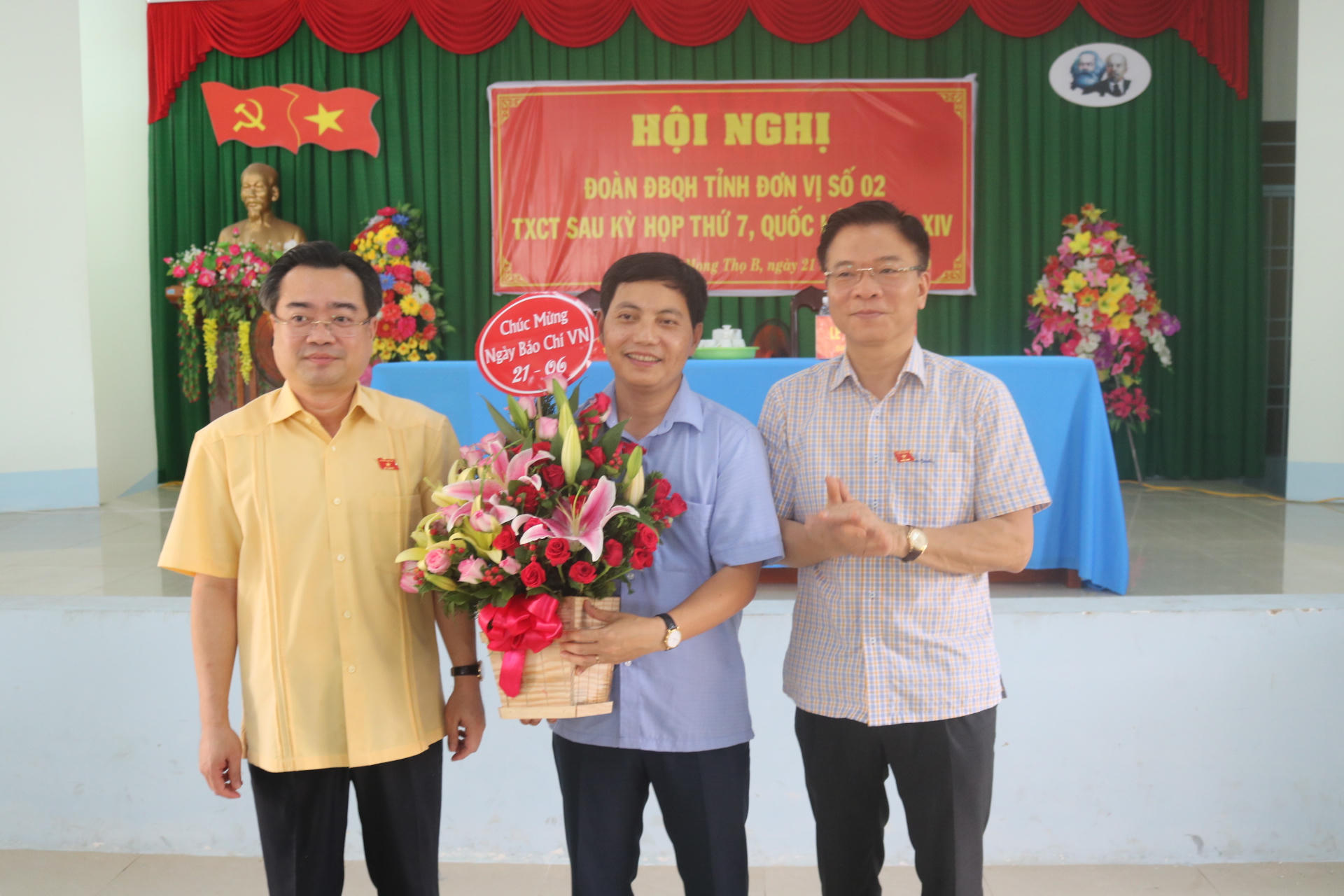 Cũng tại buổi tiếp xúc cử tri, thay mặt Đoàn ĐBQH tỉnh Kiên Giang, Bí thư Tỉnh ủy Nguyễn Thanh Nghị - Trưởng Đoàn Đại biểu Quốc hội (ĐBQH) và Bộ trưởng Bộ Tư pháp Lê Thành Long (ĐBQH) tặng hoa cho Báo Pháp luật Việt Nam chúc mừng ngày Báo chí Cách mạng Việt Nam 21/6.