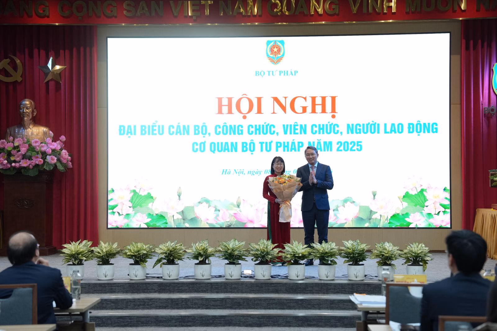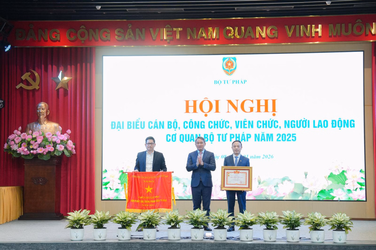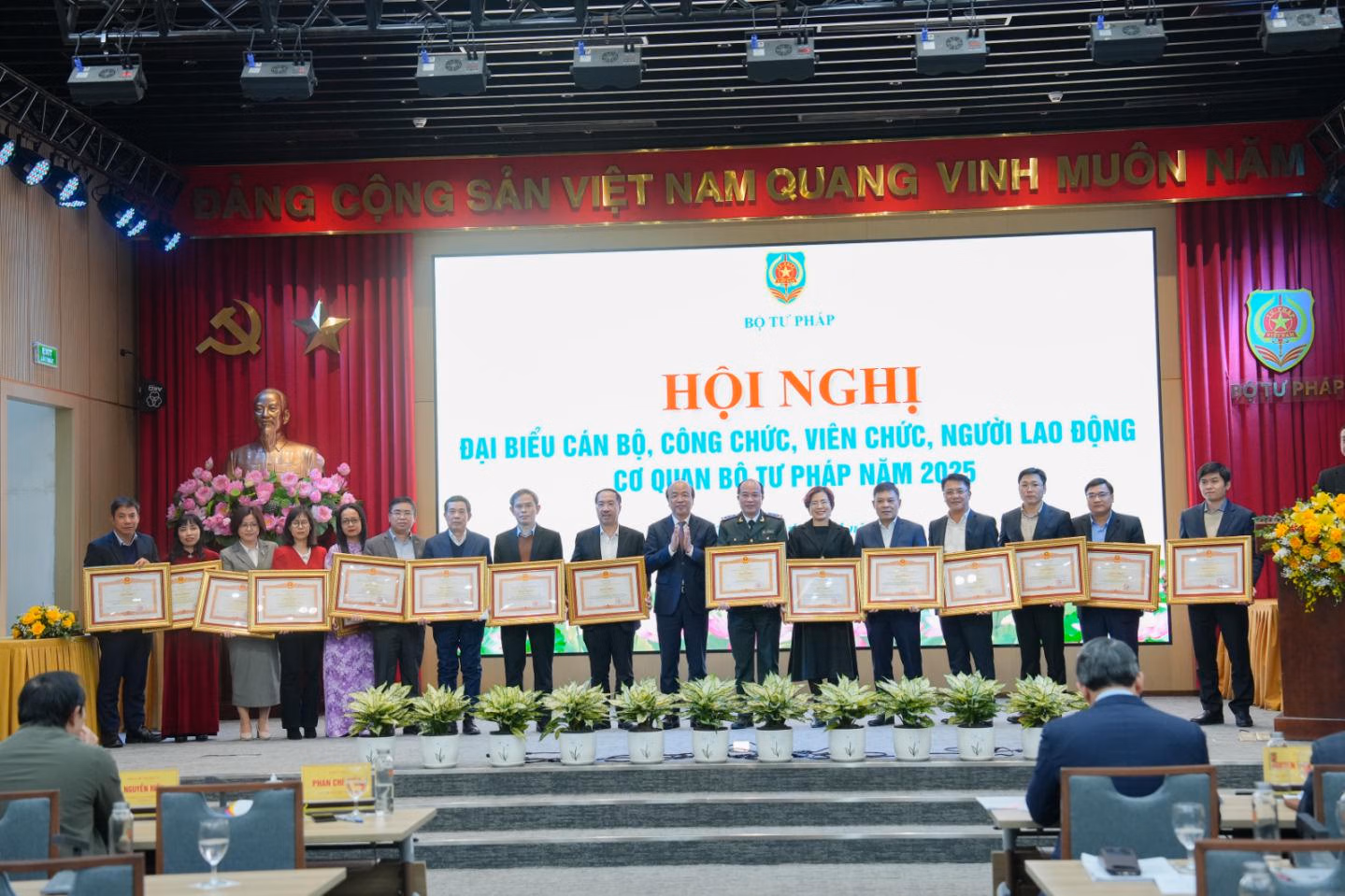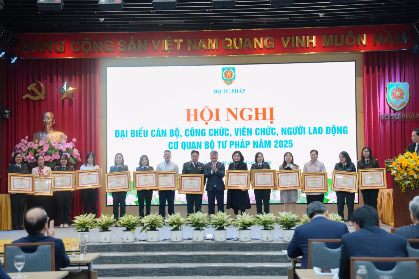 Hội nghị đã công bố và trao tặng Huân chương Lao động hạng Ba cho 1 tập thể, 2 cá nhân; danh hiệu Chiến sĩ thi đua toàn quốc cho Giám đốc Học viện Tư pháp Nguyễn Xuân Thu, Cờ thi đua của Chính phủ cho Vụ Hợp tác quốc tế; Bằng khen của Thủ tướng Chính phủ cho nhiều tập thể, cá nhân thuộc Bộ Tư pháp; đồng thời phát động phong trào thi đua năm 2026.