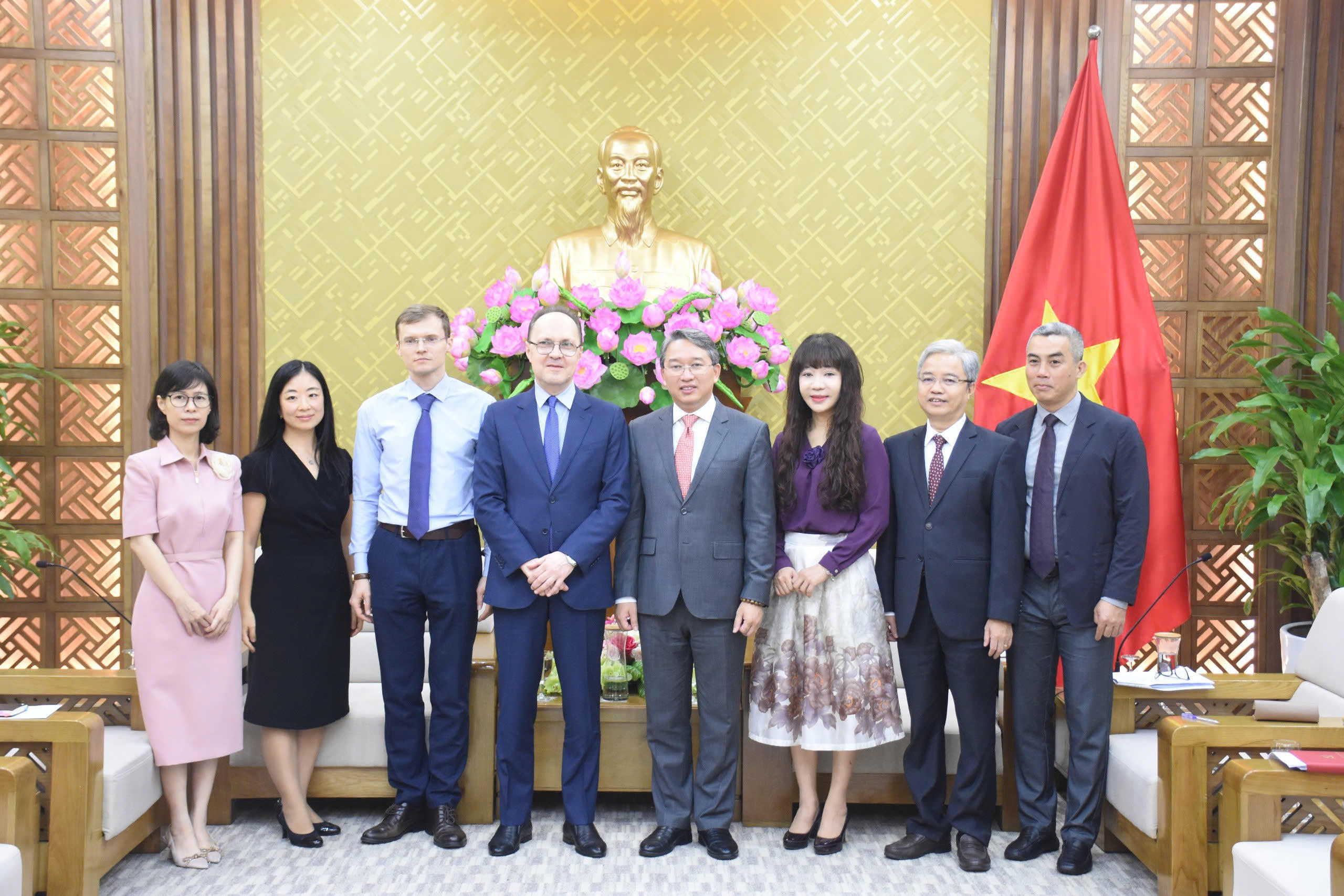 Bộ trưởng Bộ Tư pháp Nguyễn Hải Ninh và Đại sứ Đặc mệnh toàn quyền Liên bang Nga tại Việt Nam Bezdetko Gennady Stepanovich chụp ảnh lưu niệm cùng các thành viên. |