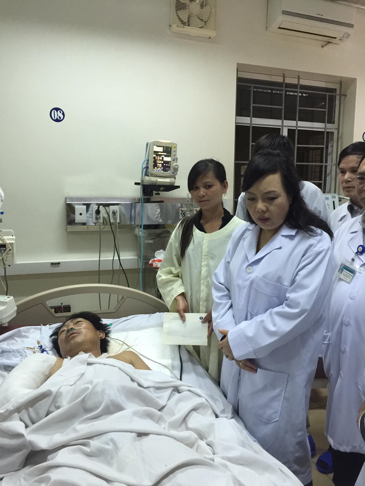 Bộ trưởng Bộ Y tế Nguyễn Thị Kim Tiến đã đến thăm hỏi, động viên và tặng quà trực tiếp cho các bệnh nhân nặng đang được chăm sóc tích cực tại Khoa Hồi sức tích cực Bệnh viện đa khoa tỉnh.