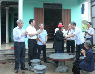 | Bộ trưởng Hà Hùng Cường cùng Đoàn công tác Bộ Tư pháp thăm và tặng quà một hộ gia đình bị thiệt hại nặng nề trong cơn bão số 10. |