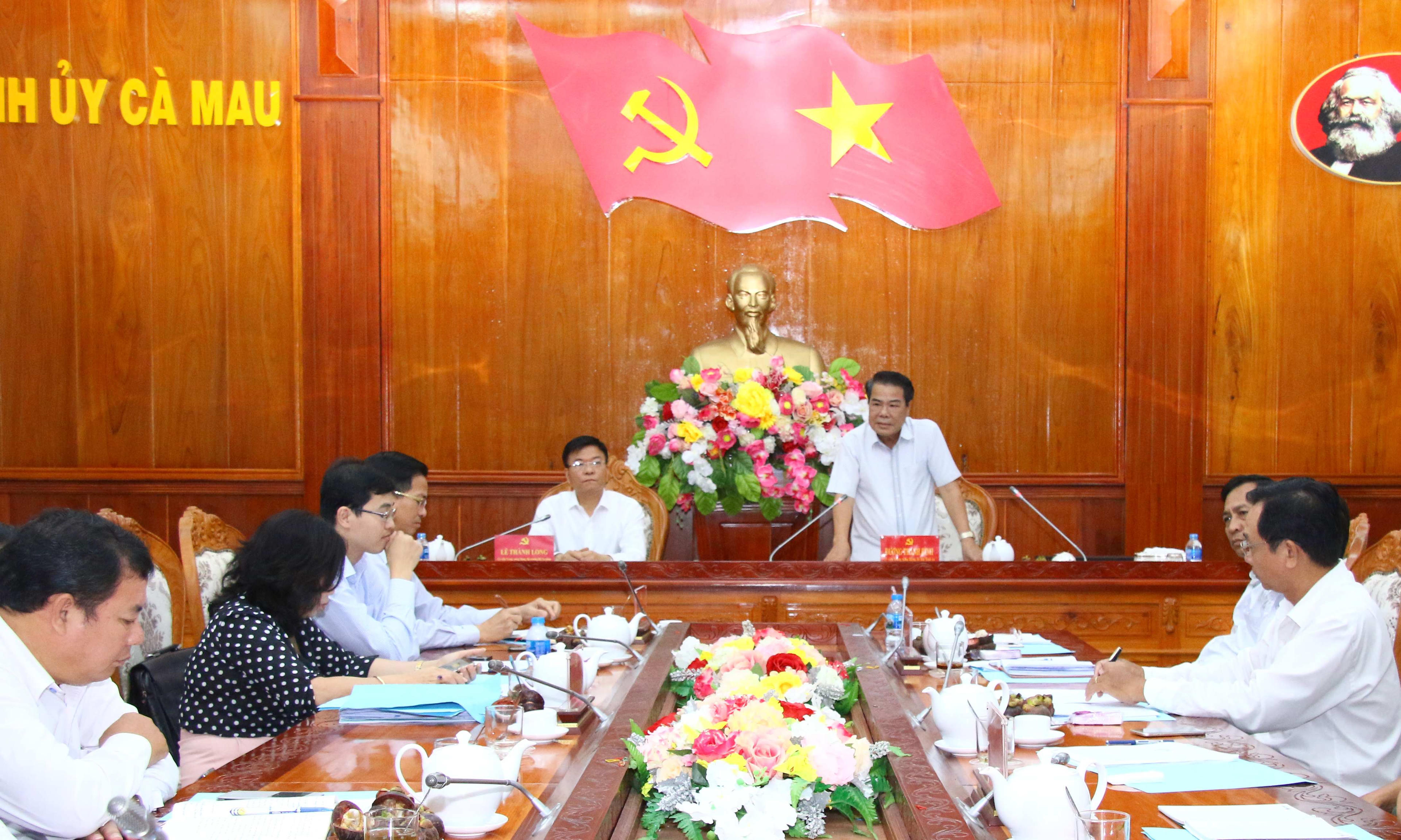 | Bí thư Tỉnh ủy Cà Mau Dương Thanh Bình phát biểu tại buổi làm việc với Bộ trưởng Bộ Tư pháp Lê Thành Long . |