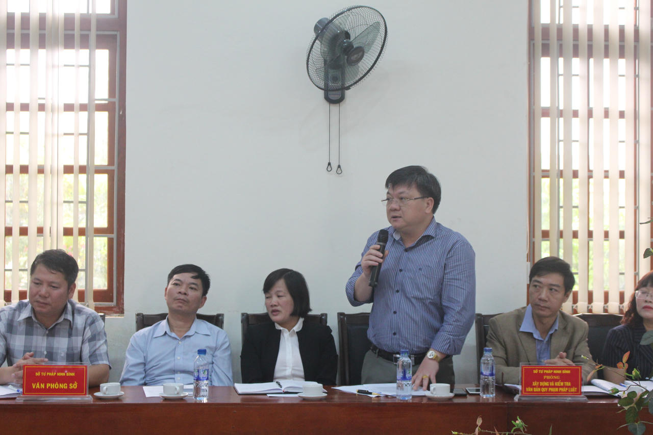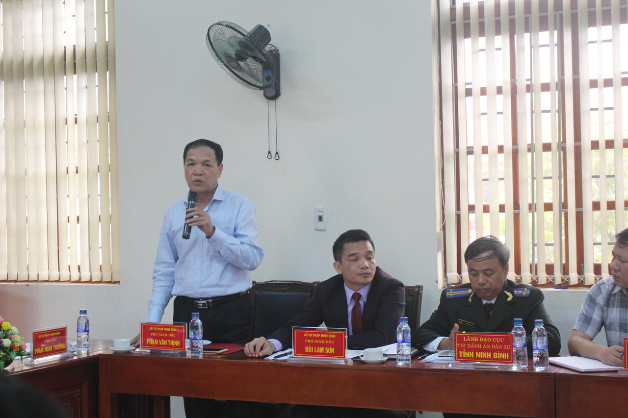 Báo cáo với đoàn công tác, Giám đốc Phạm Minh Thường đề cập đầu tiên đến công tác cán bộ ngành. Theo ông Thường, việc bố trí tăng cường cán bộ cho ngành Tư pháp được tỉnh quan tâm trước yêu cầu, đòi hỏi của nhiệm vụ mới. Tại Sở có tổng số 69 cán bộ, công chức, viên chức, người lao động, trong đó có 1 Giám đốc và 2 Phó Giám đốc. Ở cấp huyện có 8 Phòng với 32 cán bộ có trình độ đại học. Cấp xã, phường có 230 công chức Tư pháp – Hộ tịch trên tổng số 145 xã, phường, thị trấn. Công tác đào tạo, đào tạo lại và bồi dưỡng kỹ năng, nghiệp vụ cho cán bộ, công chức, viên chức ngành Tư pháp Ninh Bình tiếp tục được quan tâm nhằm nâng cao về trình độ chuyên môn, nghiệp vụ cho cán bộ, công chức, viên chức trong toàn ngành.