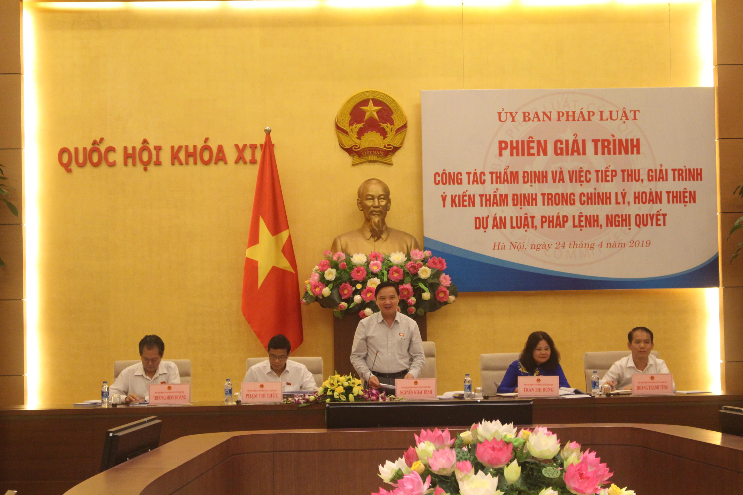 Phát biểu khai mạc, Chủ nhiệm Ủy ban Pháp luật Nguyễn Khắc Định nhấn mạnh vai trò quan trọng của công tác thẩm định văn bản trong quy trình xây dựng văn bản, ban hành chính sách. Từ đầu nhiệm kỳ đến nay, công tác thẩm định có nhiều đổi mới, nhiều kết quả tích cực, góp phần quan trọng trong kiểm soát và nâng cao chất lượng văn bản. Phiên giải trình này làm rõ những vấn đề làm được, cũng như những vấn đề chưa rõ, chưa được để kiến nghị hoàn thiện pháp luật.