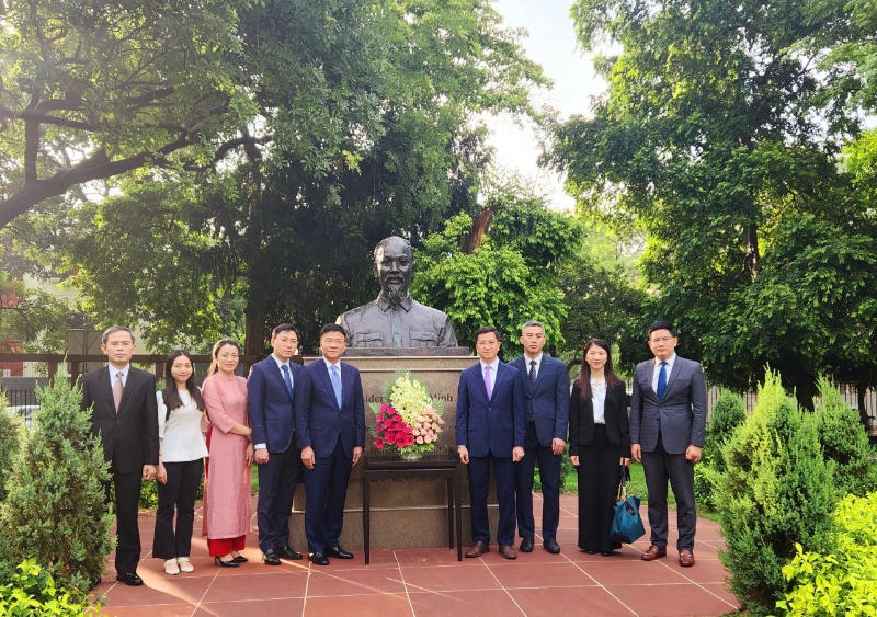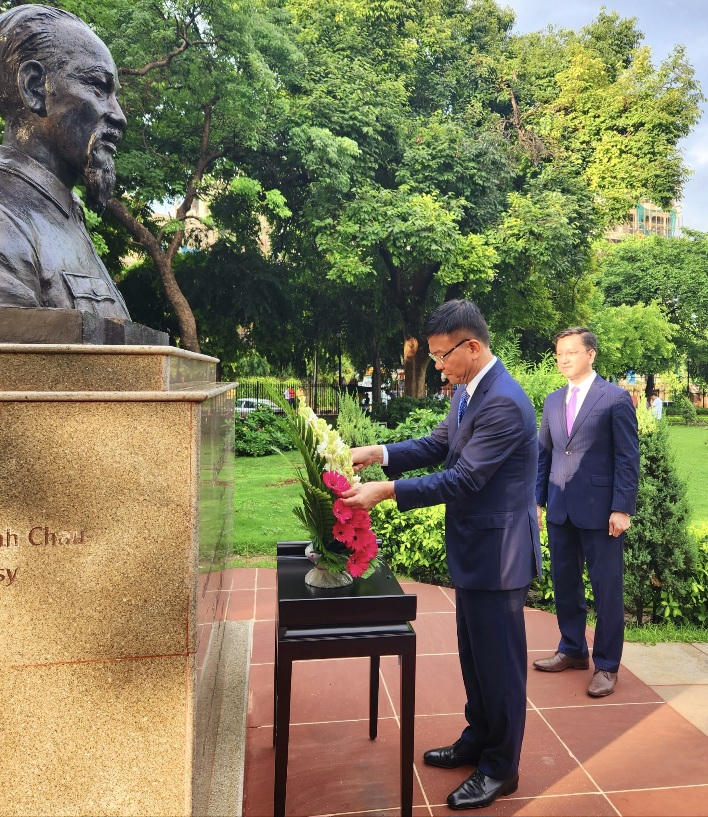 | Bộ trưởng Lê Thành Long và Đoàn công tác dâng hoa Tượng đài Chủ tịch Hồ Chí Minh tại thủ đô New Dehli. |