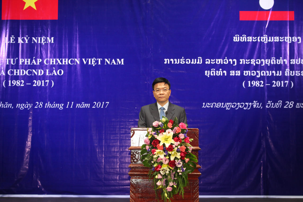 Cũng trong chuyến thăm, Bộ trưởng Lê Thành Long và Đoàn công tác đã dự Lễ kỷ niệm 35 năm Hợp tác tư pháp CHXHCN Việt Nam và CHDCND Lào. Tại buổi lễ, trong hai diễn văn quan trọng của hai Bộ trưởng Tư pháp Việt Nam – Lào đều khẳng định sau 35 năm thiết lập và được các thế hệ lãnh đạo và cán bộ Ngành Tư pháp hai nước đặc biệt quan tâm thúc đẩy, mối quan hệ này đã và đang ngày càng phát triển đi vào chiều sâu, thực chất và hiệu quả với nội dung hợp tác phong phú cả ở cấp Trung ương và ở cấp địa phương. Hợp tác về đào tạo luật cũng ngày càng được đẩy mạnh, góp phần tích cực vào việc đào tạo, nâng cao năng lực đội ngũ cán bộ pháp luật và tư pháp của Lào. Thay mặt Ban cán sự Đảng, Lãnh đạo Bộ Tư pháp Việt Nam, Bộ trưởng Lê Thành Long ghi nhận và đánh giá cao công lao, những đóng góp to lớn của các thế hệ cán bộ tư pháp của hai nước, những đồng chí, người bạn đã cùng đồng cam cộng khổ trong mỗi bước đường trưởng thành của hai Ngành Tư pháp Việt – Lào. Đồng thời, trong buổi Lễ long trọng này, Bộ trưởng cũng gửi lời cảm ơn chân thành và sâu sắc nhất đối với Đảng, Nhà nước, nhân dân các bộ tộc Lào và Ngành Tư pháp Lào anh em đã ủng hộ mạnh mẽ và luôn kề vai, sát cánh cùng Ngành Tư pháp Việt Nam.