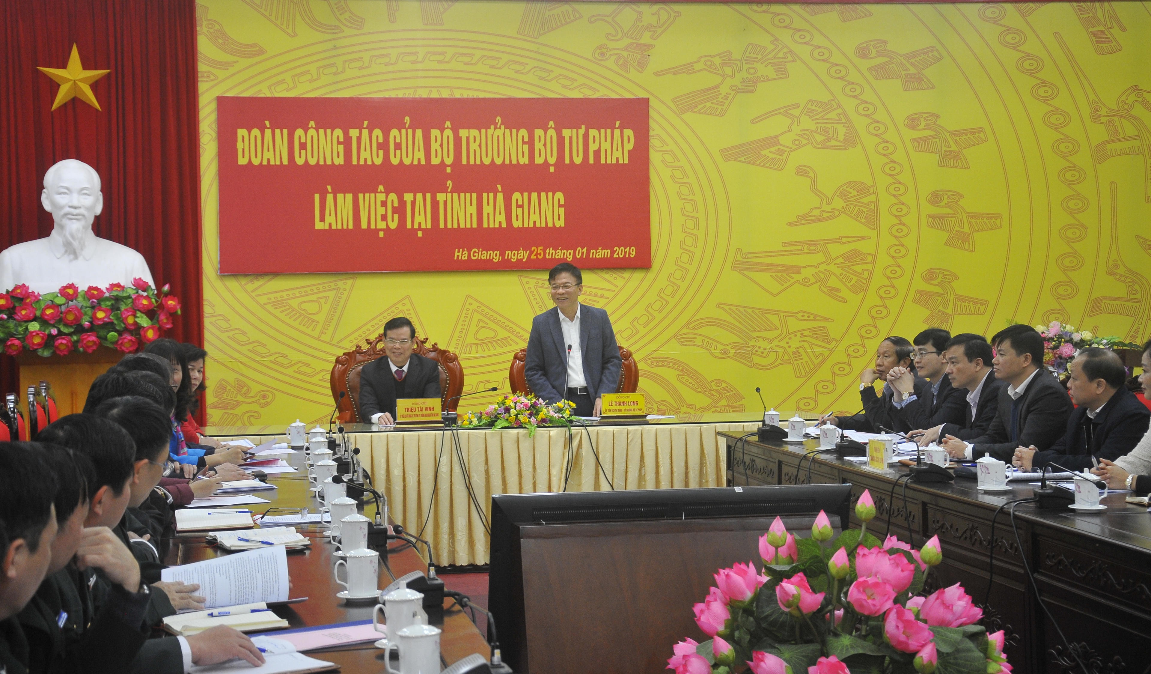 Tham dự buổi làm việc có các đồng chí: Triệu Tài Vinh, Ủy viên Ban Chấp hành Trung ương Đảng, Bí thư Tỉnh ủy, Trưởng Đoàn Đại biểu Quốc hội khóa XIV đơn vị tỉnh Hà Giang; Chúng Thị Chiên, Ủy viên Ban Thường vụ Tỉnh ủy, Phó Chủ tịch Thường trực HĐND tỉnh; Trần Đức Quý, Tỉnh ủy viên, Phó Chủ tịch UBND tỉnh; lãnh đạo Sở Tư pháp, Cục THADS tỉnh và Chi cục THADS các huyện, thành phố.