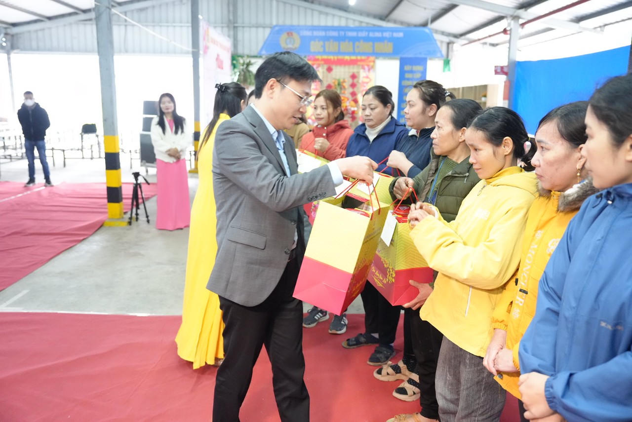 Bộ trưởng Lê Thành Long và Bí thư Tỉnh ủy Đỗ Trọng Hưng trao 100 suất quà của Tổng Liên đoàn lao động Việt Nam cho công nhân lao động Công ty TNHH giày Alina.