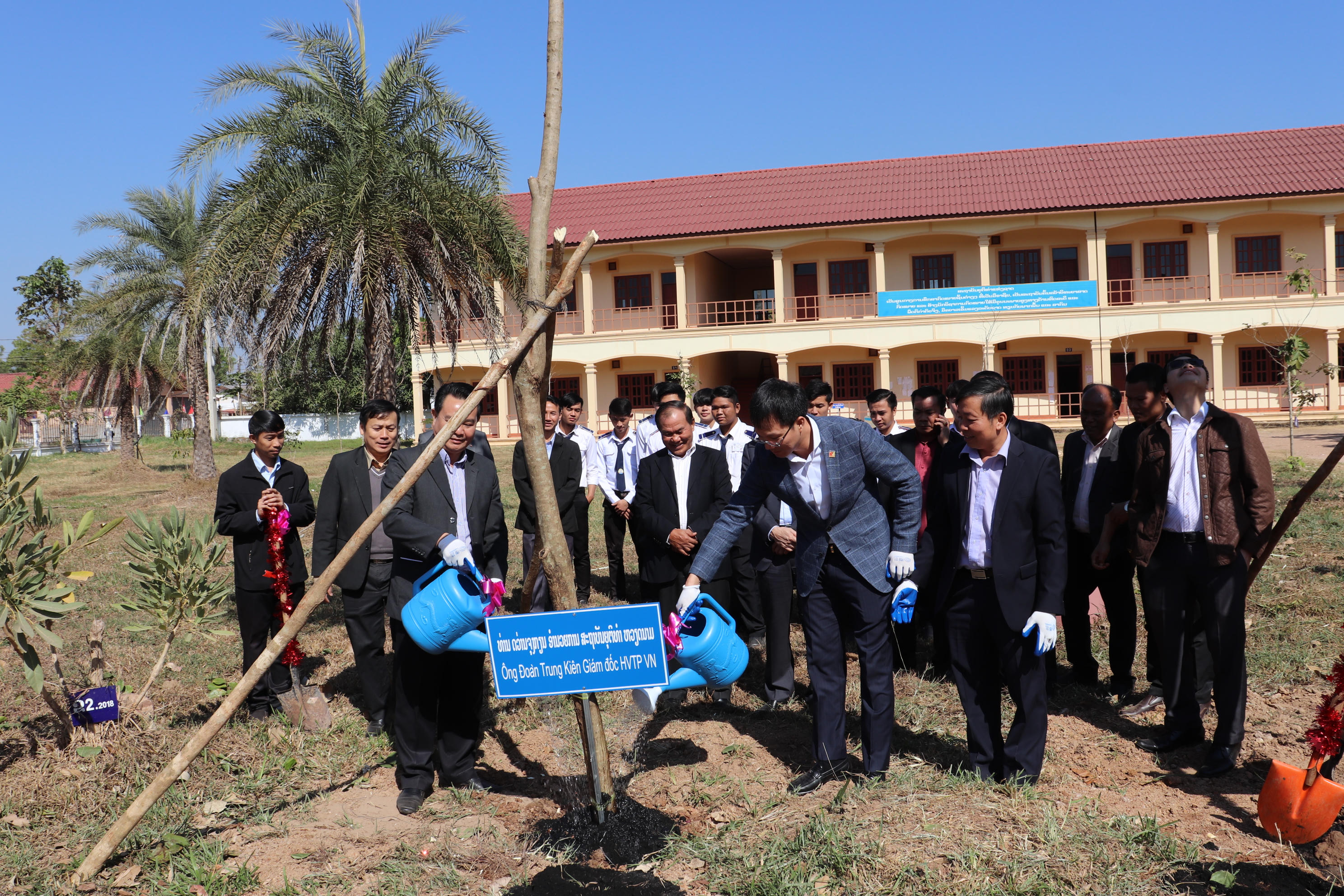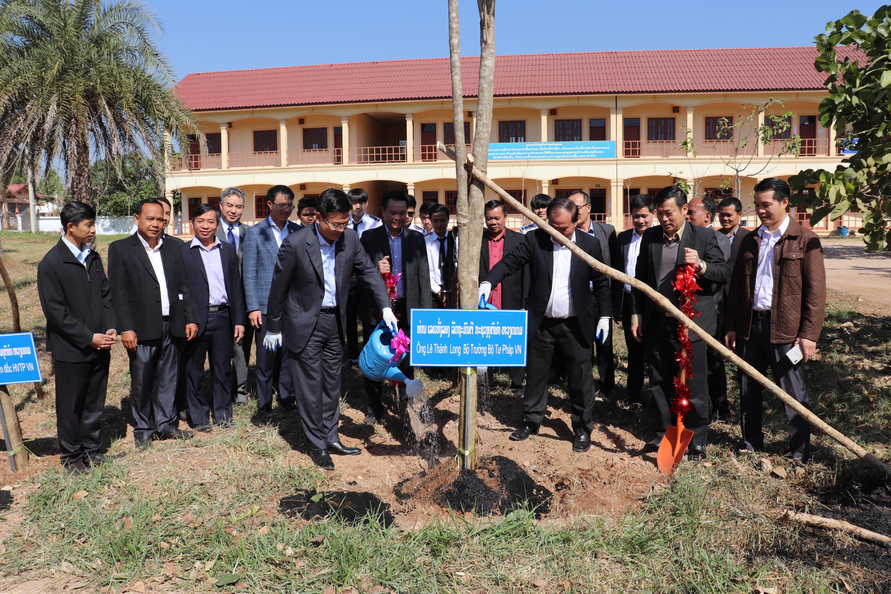 Nhân dịp tới thăm và làm việc với Học viện Tư pháp QG Lào, Bộ trưởng Lê Thành Long và Giám đốc Đoàn Trung Kiên đã trồng cây lưu niệm trong khuôn viên Học viện.