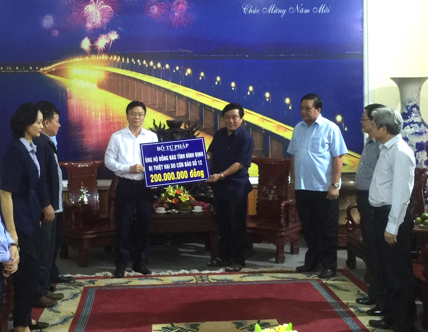 Tại Bình Định: Bộ trưởng Lê Thành Long và đoàn công tác đã thăm hỏi, chia sẻ và trao 200 triệu đồng hỗ trợ người dân vùng lũ. Bộ trưởng Bộ Tư pháp Lê Thành Long cho biết: “ Đây là số tiền do cán bộ, công chức, viên chức, người lao động Bộ Tư pháp muốn san sẻ bớt những khó khăn của người dân bị ảnh hưởng nặng nề do hậu quả của cơn bão số 12. Tuy số tiền hỗ trợ không nhiều, nhưng thể hiện sự “tương thân tương ái” theo truyền thống quý báu của dân tộc Việt Nam”. Bộ trưởng cũng mong muốn người dân vùng lũ sớm vượt qua những khó khăn, khắc phục hậu quả do mưa bão.