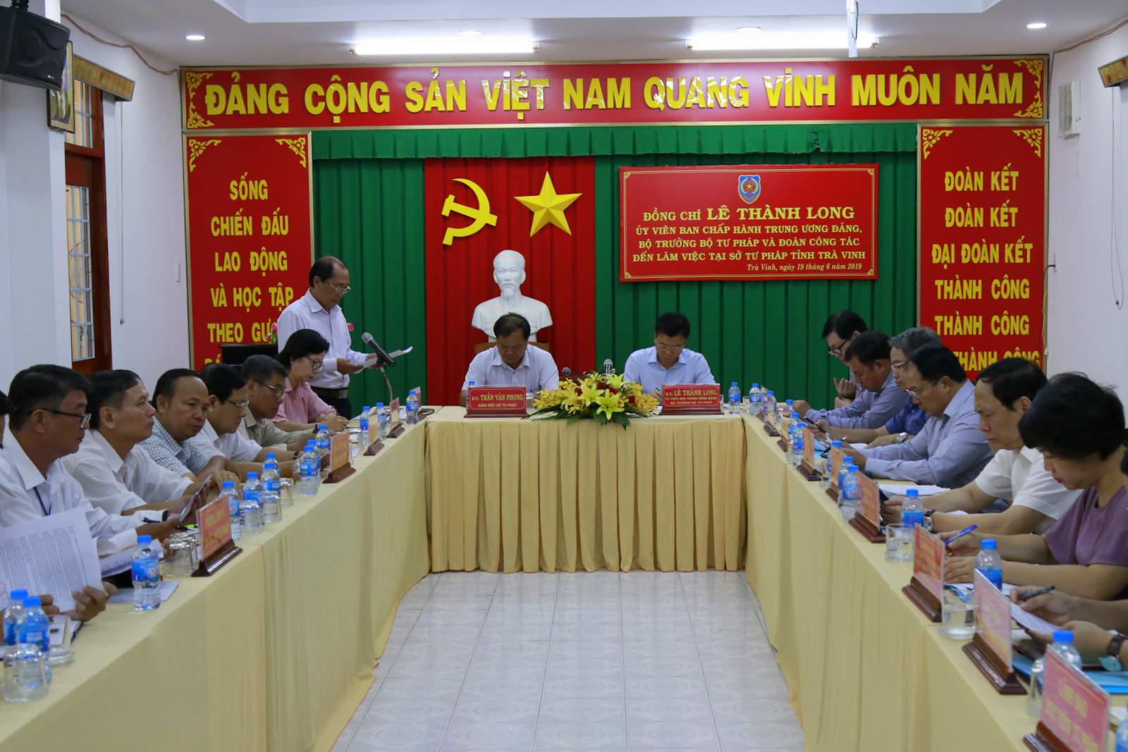 (PLVN) - Sáng ngày 19/6, đồng chí Lê Thành Long, Uỷ viên Ban Chấp hành Trung ương Đảng, Bộ trưởng Bộ Tư pháp và Đoàn công tác đến thăm và làm việc tại Sở Tư pháp tỉnh Trà Vinh. Tiếp và làm việc với đoàn có ông Trần Văn Phong, Giám đốc Sở Tư pháp; các Phó Giám đốc. Đại diện Hội Luật gia; Đoàn Luật sư tỉnh; cùng lãnh đạo các phòng chuyên môn, Phòng Tư pháp các huyện, thành phố.