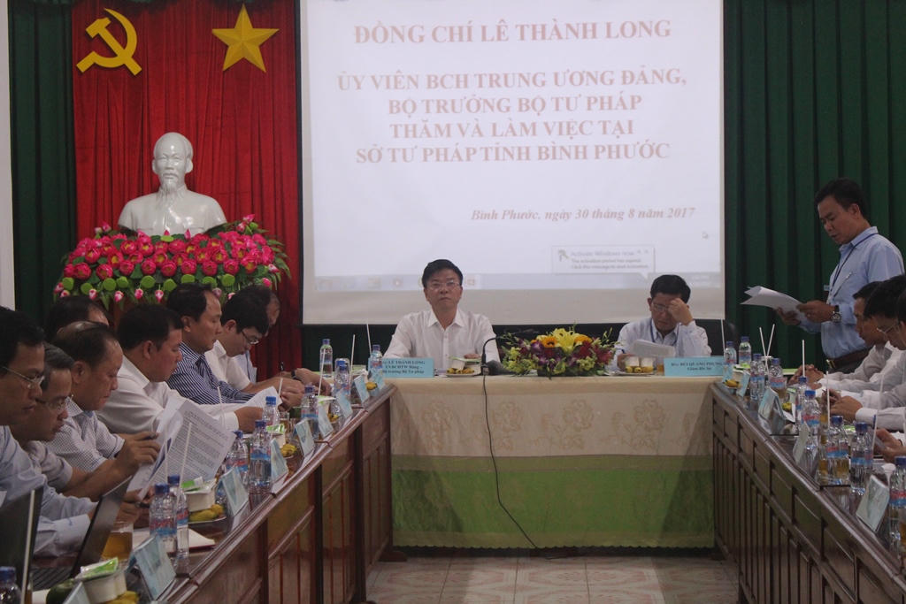 Nhận xét về những vấn đề trong báo cáo, Bộ trưởng Lê Thành Long đã lưu ý Sở Tư pháp Bình Phước cần chủ động trong công tác để tìm cách tháo gỡ những khó khăn, vướng mắc đang gặp phải. Bộ trưởng cũng nhắc nhở cần tăng cường thanh tra, kiểm tra, bám sát chặt chẽ trong việc thực hiện các nghề tư pháp, các dịch vụ pháp lý như đấu giá, công chứng, trợ giúp pháp lý... Tiến hành xã hội hóa nhưng không phải hoàn toàn, phải giữ được đặc thù của ngành. Trong quá trình chỉ đạo điều hành phải sắp xếp, ưu tiên thứ tự giải quyết công việc, giảm thời gian hội họp không cần thiết để tập trung giải quyết công việc.