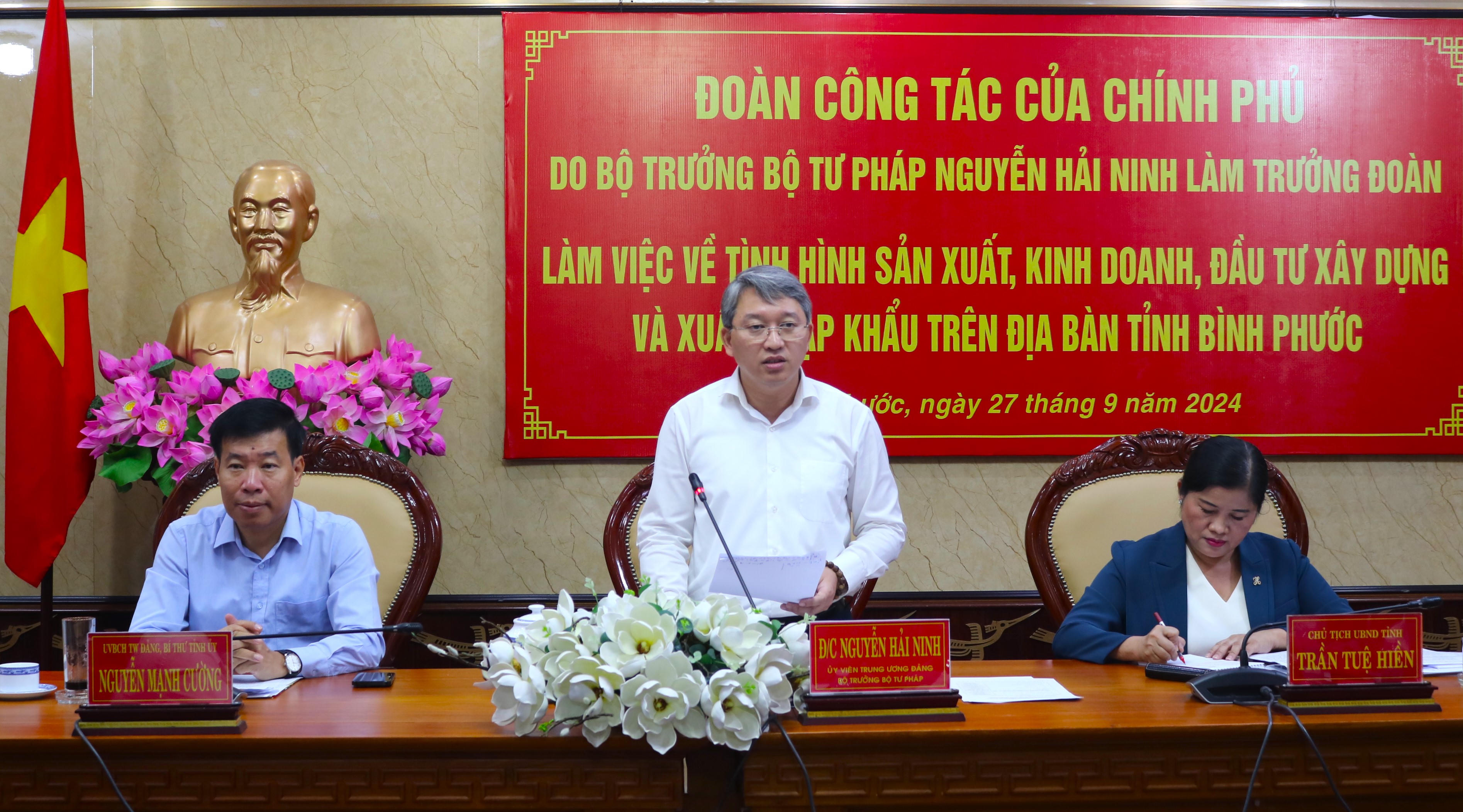 Cùng đi có đại diện các Bộ, ngành Trung ương: Bộ Kế hoạch và Đầu tư, Bộ Công thương, Bộ Tài chính, Bộ Giao thông vận tải, Bộ Tài nguyên và Môi trường, Bộ Xây dựng, Bộ Công an, Bộ Nông nghiệp và Phát triển nông thôn, Ngân hàng Nhà nước Việt Nam; một số đơn vị thuộc Bộ Tư pháp.Tiếp và làm việc với Đoàn có Bí thư Tỉnh uỷ Nguyễn Mạnh Cường cùng lãnh đạo các sở, ban, ngành của tỉnh Bình Phước.