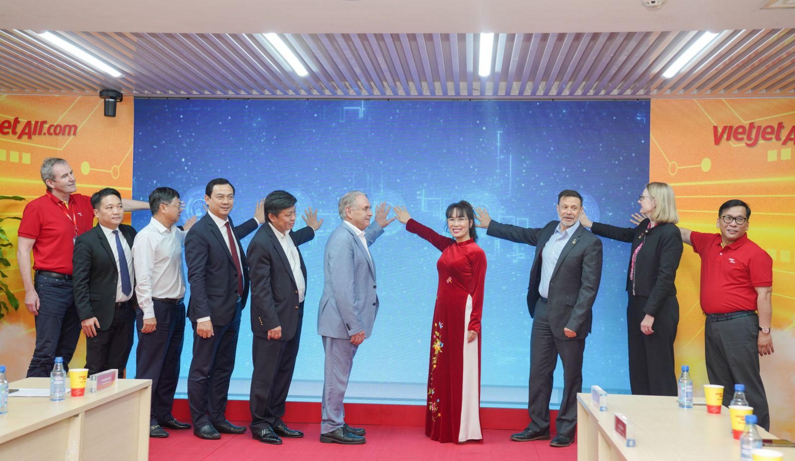 Chủ tịch Nguyễn Thị Phương Thảo, Tổng giám đốc Vietjet Đinh Việt Phương chào mừng Bộ trưởng Don Farrell (thứ hai từ trái sang) và Đại sứ Úc tại Việt Nam Andrew Goledzinowski (ngoài cùng bên phải) |