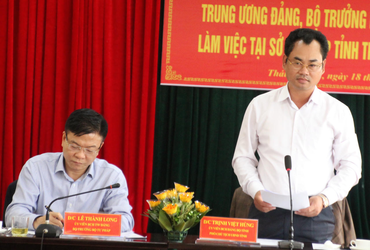 Phát biểu tại buổi làm việc, ông Trịnh Việt Hùng, Phó Chủ tịch UBND tỉnh Thái Nguyên cảm ơn sự quan tâm của Bộ trưởng Lê Thành Long cũng như những đánh giá tích cực của lãnh đạo các đơn vị thuộc Bộ Tư pháp đối với Tư pháp Thái Nguyên.