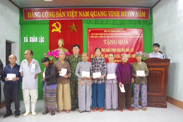 Nhân dịp này, Bộ Tư lệnh Quân khu 7 cũng hỗ trợ Ủy ban MTTQ Việt Nam huyện Phú Lộc và thị xã Hương Thủy 200 triệu đồng. Đồng thời, đoàn công tác trao 250 suất quà cho 250 hộ dân bị ảnh hưởng của bão, lụt trên địa bàn phường Thủy Châu, Thủy Tân, Thủy Lương, thị xã Hương Thủy và xã Xuân Lộc, huyện Phú Lộc, mỗi gia đình 2 triệu đồng.