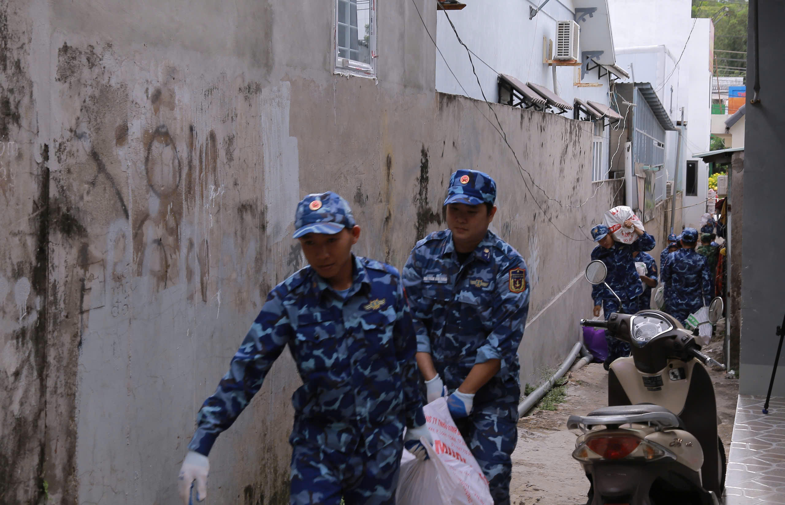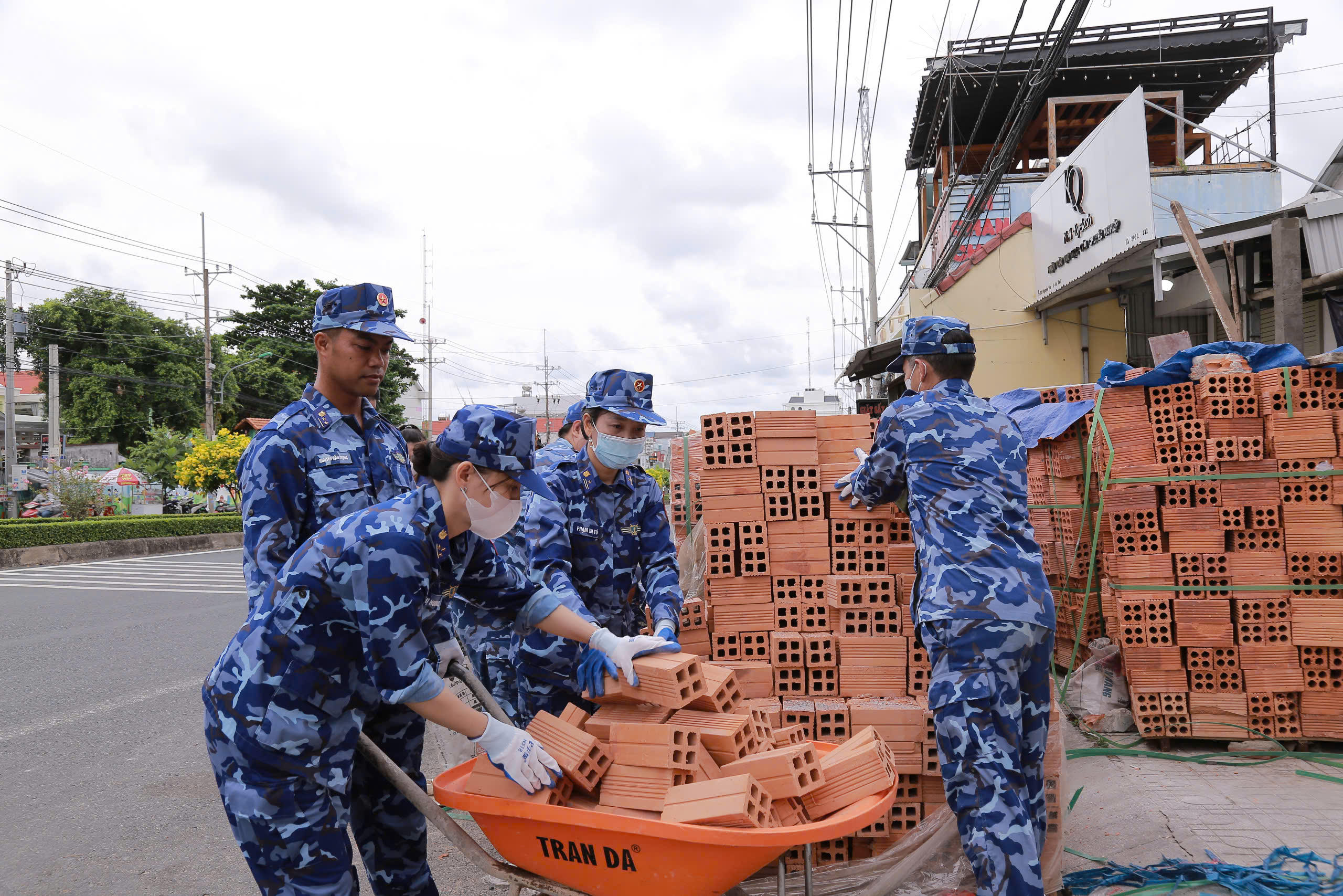 Cán bộ, đoàn viên, hội viên BTL Vùng Cảnh sát biển 4 tham gia vận chuyển vật liệu xây dựng, hỗ trợ gia đình ông Nguyễn Văn Nâu. |