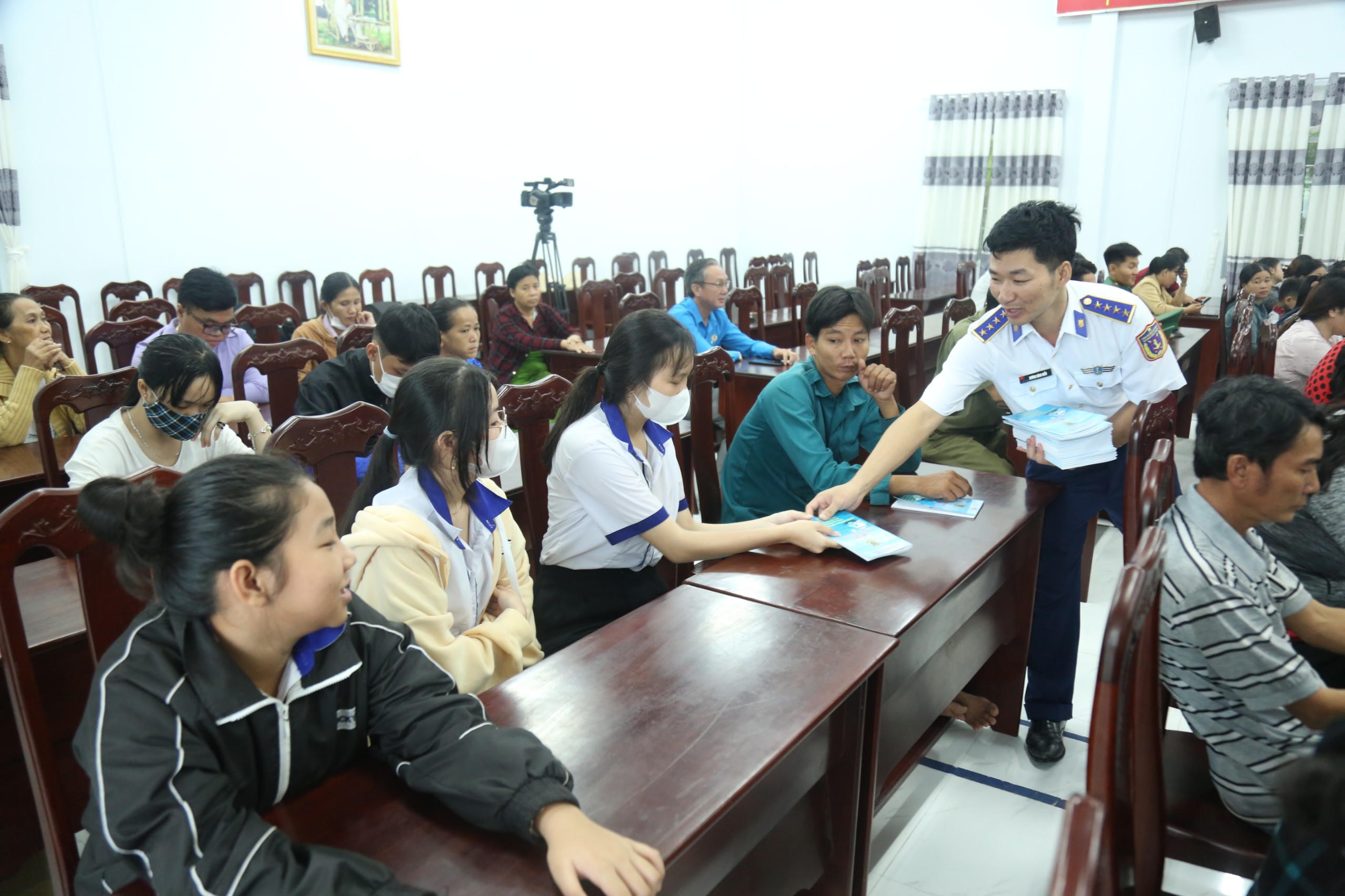 Tuyên truyền viên của Bộ Tư lệnh Vùng Cảnh sát biển 4 cấp phát tài liệu tuyên truyền cho người dân tại hội nghị |
