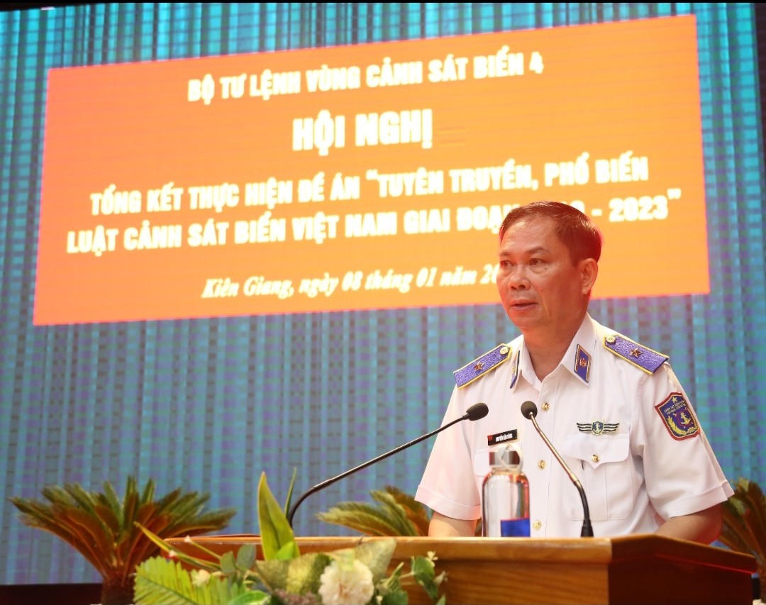 (PLVN) - Sáng 08/01, tại thành phố Phú Quốc, tỉnh Kiên Giang, Bộ Tư lệnh (BTL) Vùng Cảnh sát biển 4 tổ chức Hội nghị tổng kết thực hiện Đề án “Tuyên truyền, phổ biến Luật Cảnh sát biển Việt Nam giai đoạn 2019 - 2023”. Thiếu tướng Nguyễn Văn Dũng - Chính ủy BTL Vùng chủ trì hội nghị.