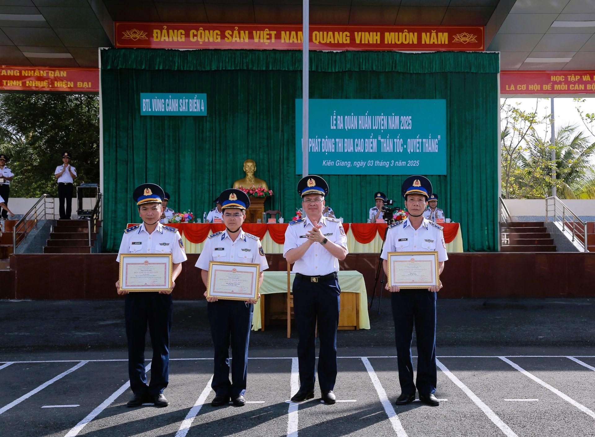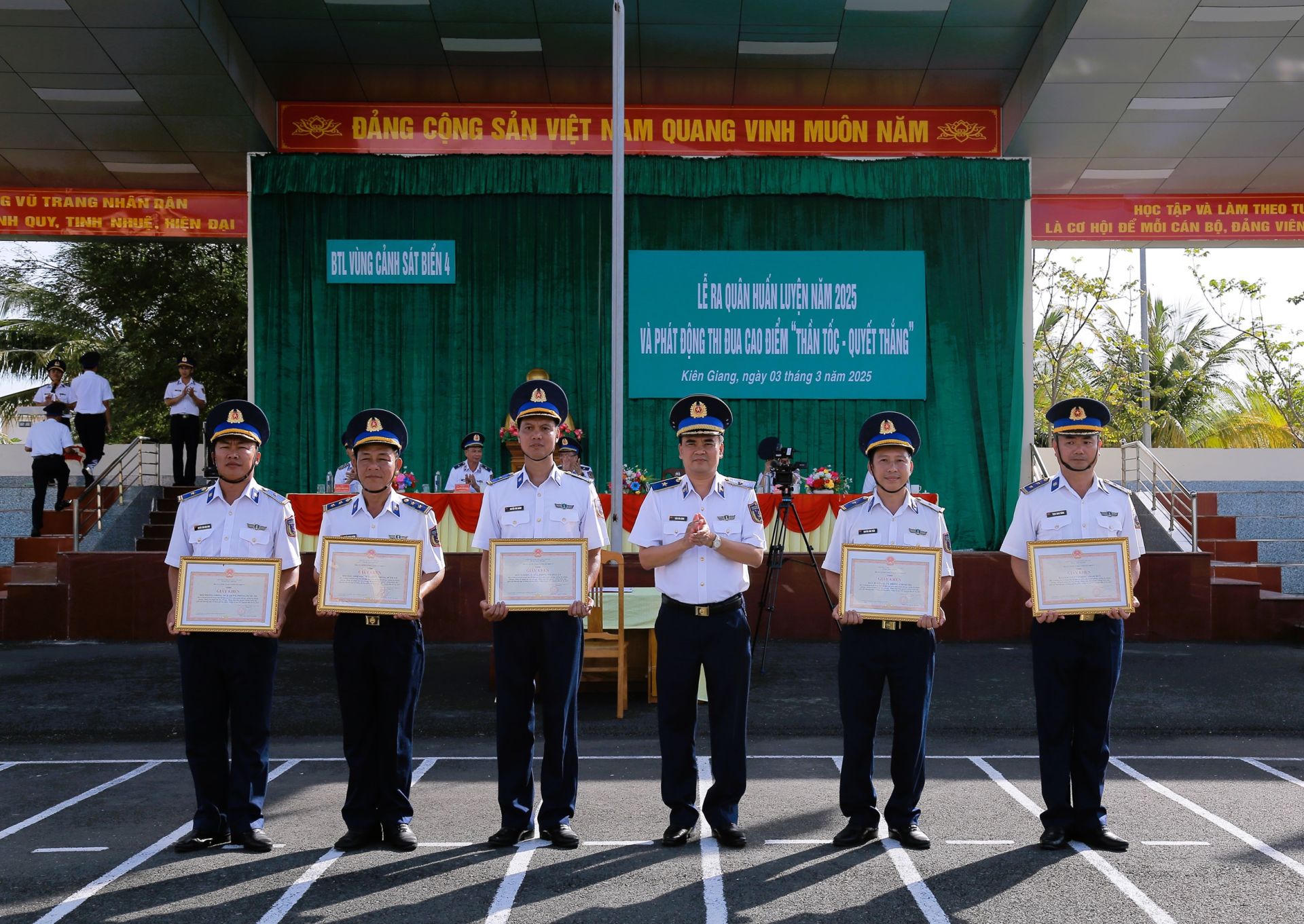 Tại buổi Lễ, Thiếu tướng Lê Đình Cường đã trao tặng danh hiệu Đơn vị vững mạnh toàn diện “mẫu mực tiêu biểu” và Đơn vị huấn luyện giỏi năm 2024 cho Phòng Phòng chống tội phạm, vi phạm; Phòng Pháp luật và Hải đội 401. Thủ trưởng Bộ Tư lệnh Vùng Cảnh sát biển 4 đã tặng giấy khen cho 5 tập thể và 7 cá nhân có thành tích xuất sắc trong Đợt thi đua cao điểm đấu tranh phòng, chống tội phạm; phòng, chống tội phạm ma túy; phòng, chống mua bán người; chống buôn lậu, gian lận thương mại và hàng giả dịp trước, trong và sau Tết Nguyên đán Ất Tỵ 2025.