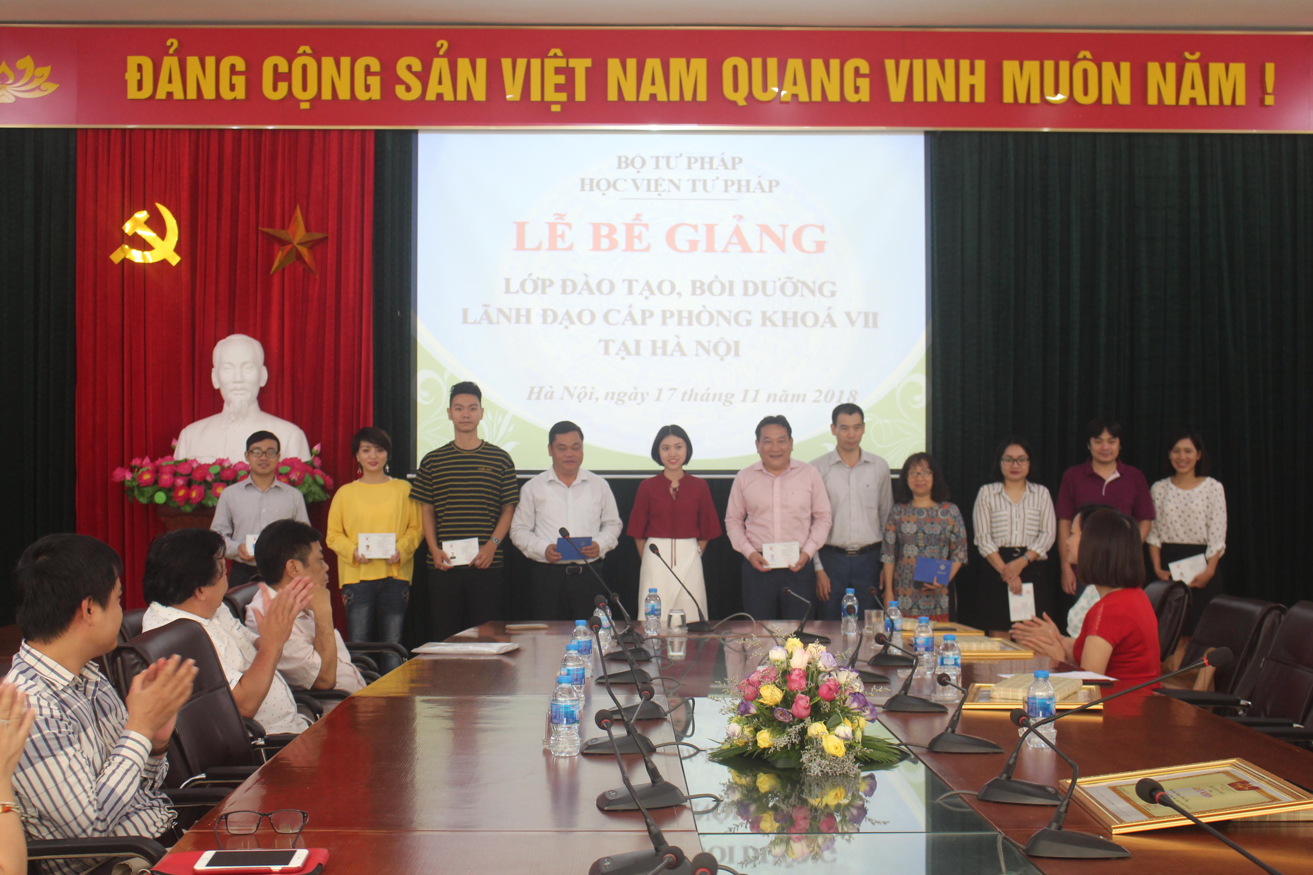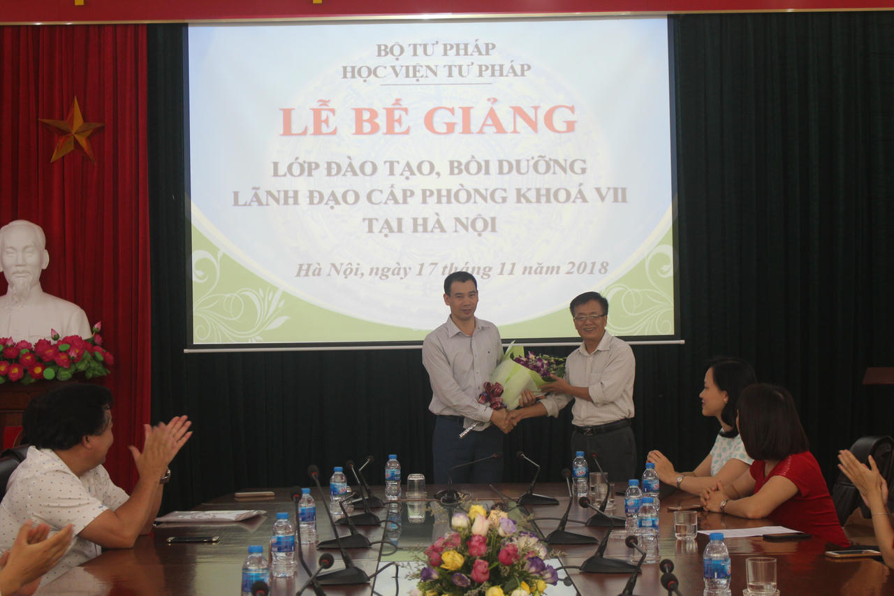 Ngày 14/11 vừa qua, Giám đốc Học viện Tư pháp đã ký quyết định công nhận hoàn thành chương trình và cấp chứng chỉ hoàn thành chương trình đào tạo, bồi dưỡng lãnh đạo cấp phòng khóa VII năm 2018 cho 142 học viên (đạt tỷ lệ 93,42%). Tiếp đó, Giám đốc Học viện cũng ký quyết định khen thưởng 8 học viên lớp khóa VII đã có thành tích trong phong trào xây dựng trường lớp và có thành tích trong học tập.
