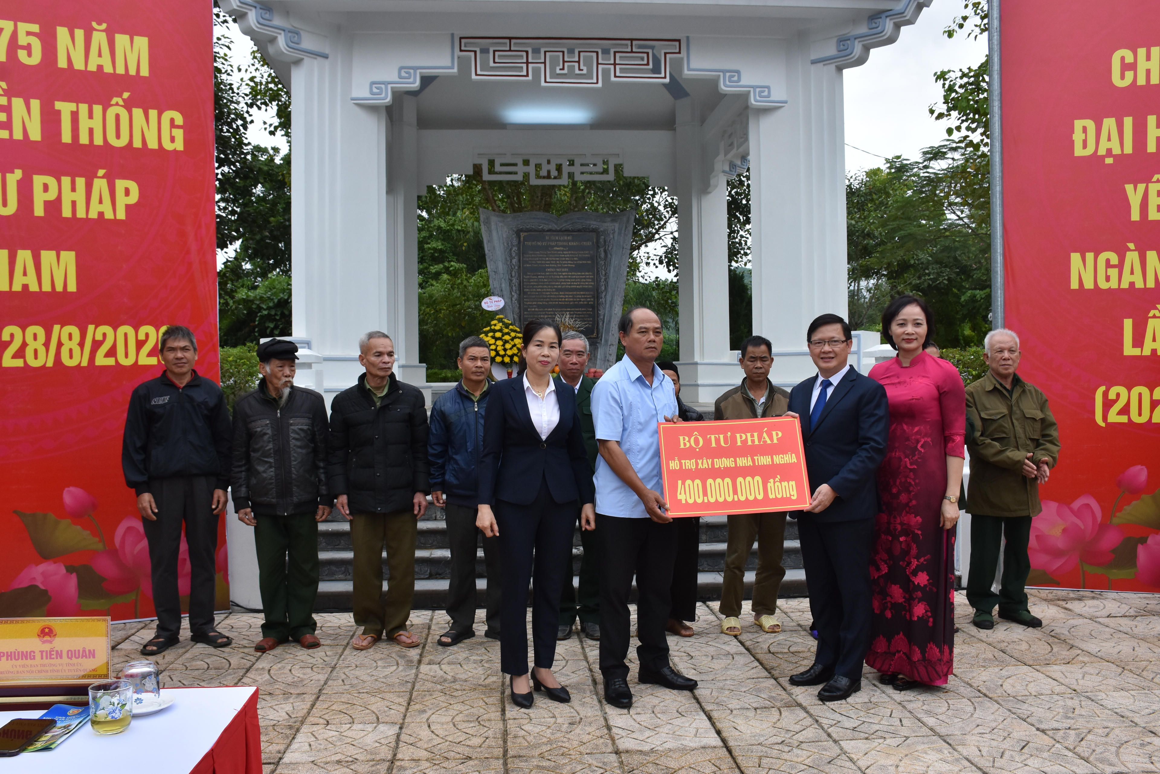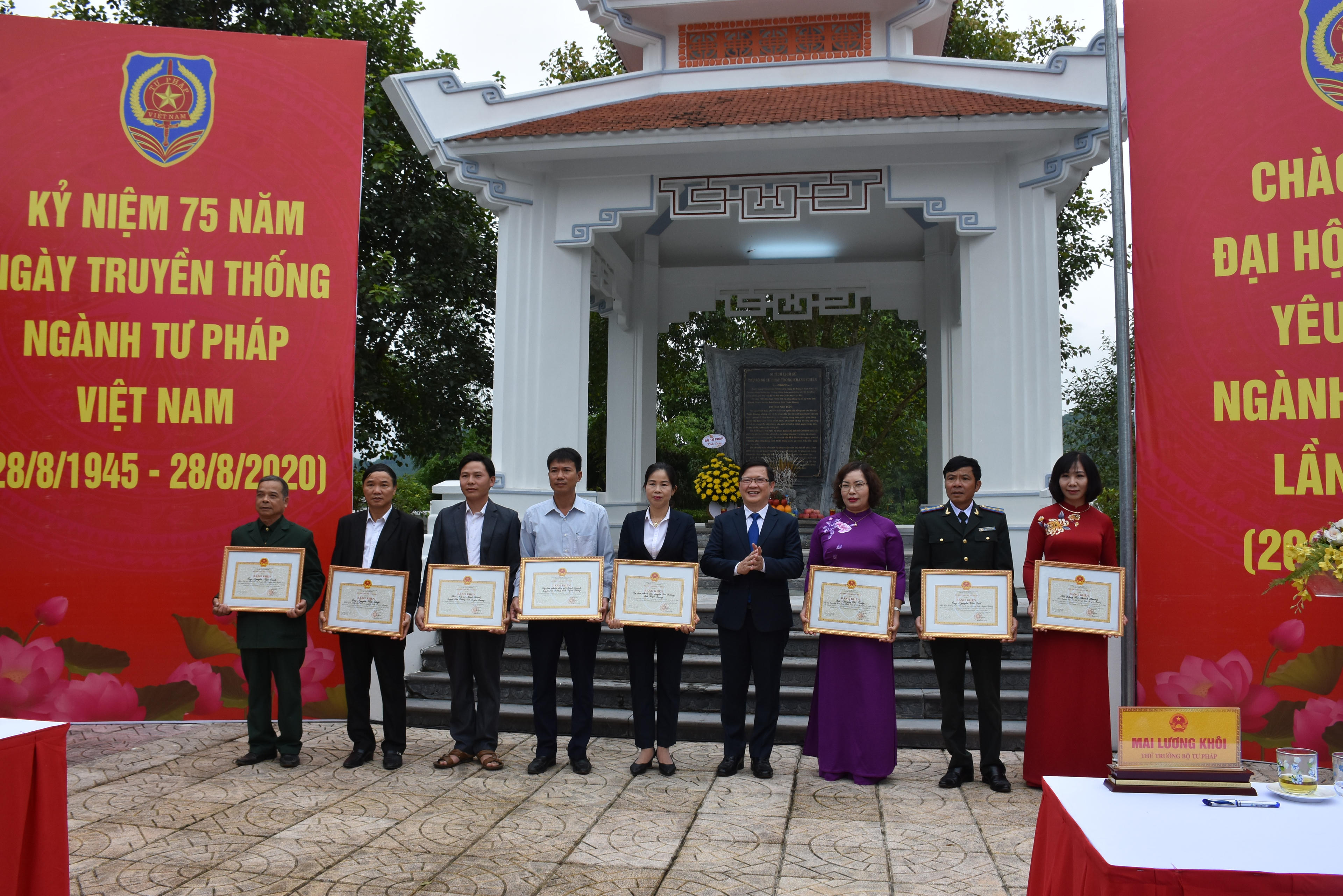 Cũng trong dịp này, Bộ Tư pháp đã trao Bằng khen của Bộ trưởng Bộ Tư pháp cho 3 tập thể, 7 cá nhân có nhiều đóng góp trong công tác tôn tạo, bảo vệ Khu di tích lịch sử của Bộ; trao kinh phí hỗ trợ xây dựng nhà tình nghĩa cho các hộ gia đình có công với cách mạng, gia đình chính sách với tổng giá trị 400 triệu đồng. Đoàn Thanh niên Bộ Tư pháp phối hợp với Đoàn Thanh niên huyện Sơn Dương gắn biển tên Công trình thanh niên “Sân chơi thiếu nhi” và trao tặng nhiều phần quà ý nghĩa cho các cháu thiếu nhi của thôn Mới.