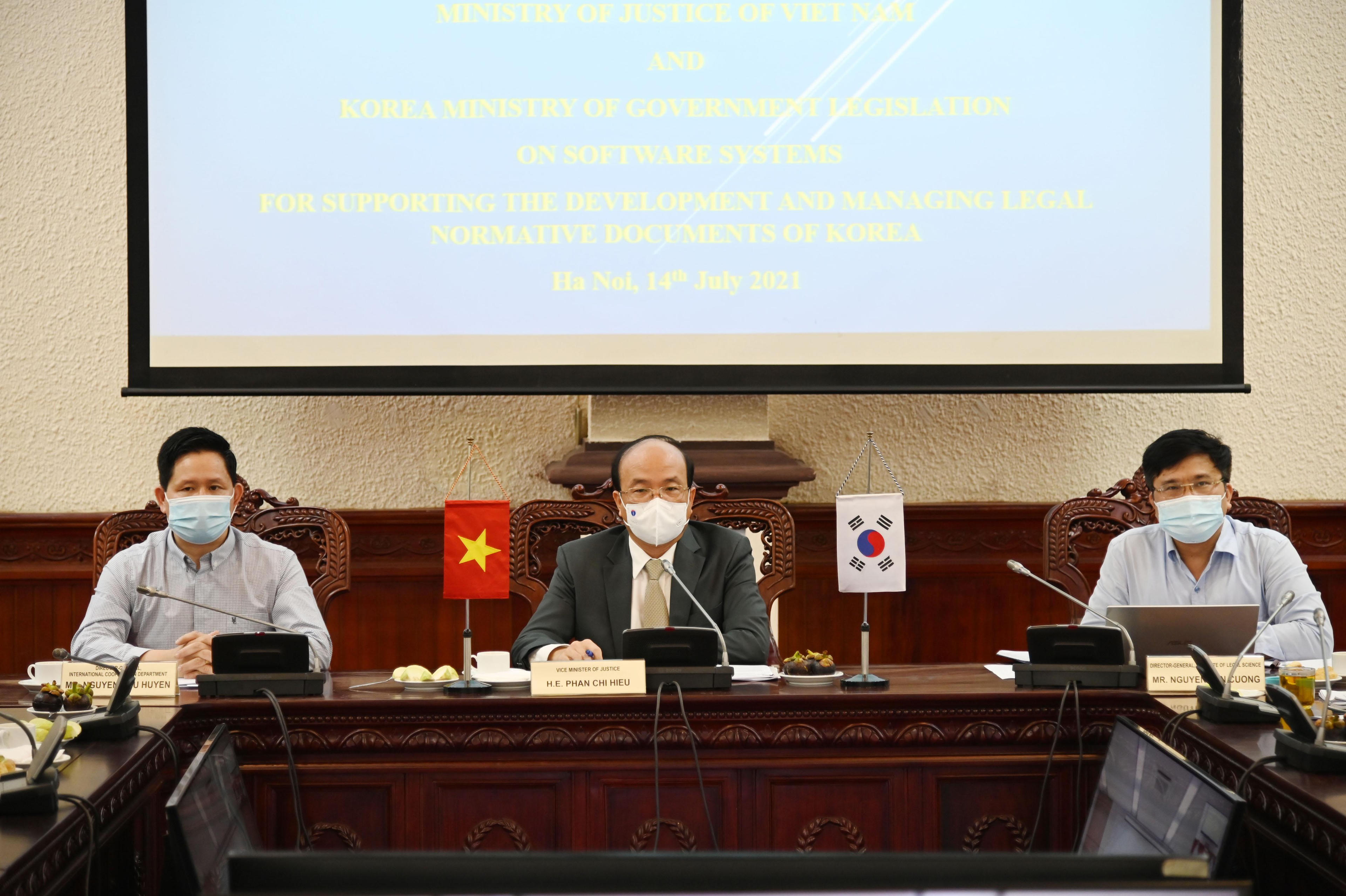 (PLVN) -Chiều 14/7, Thứ trưởng Bộ Tư pháp Phan Chí Hiếu đã chủ trì Hội thảo trực tuyến Bộ Tư pháp Việt Nam và Bộ Lập pháp Chính phủ Hàn Quốc về các hệ thống phần mềm hỗ trợ xây dựng, quản lý văn bản quy phạm pháp luật của Hàn Quốc. Về phía Hàn Quốc có ông Han Yeong Soo, Thứ trưởng Bộ Lập pháp Hàn Quốc.
