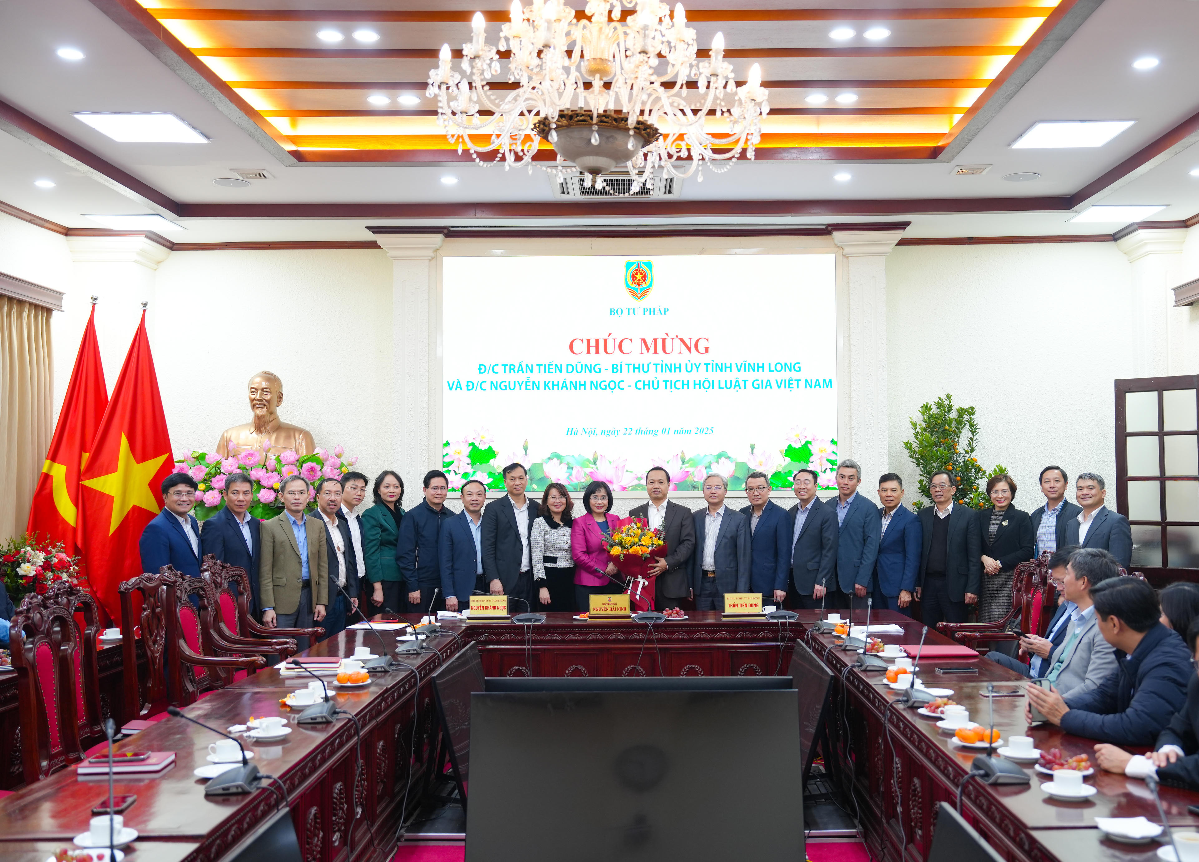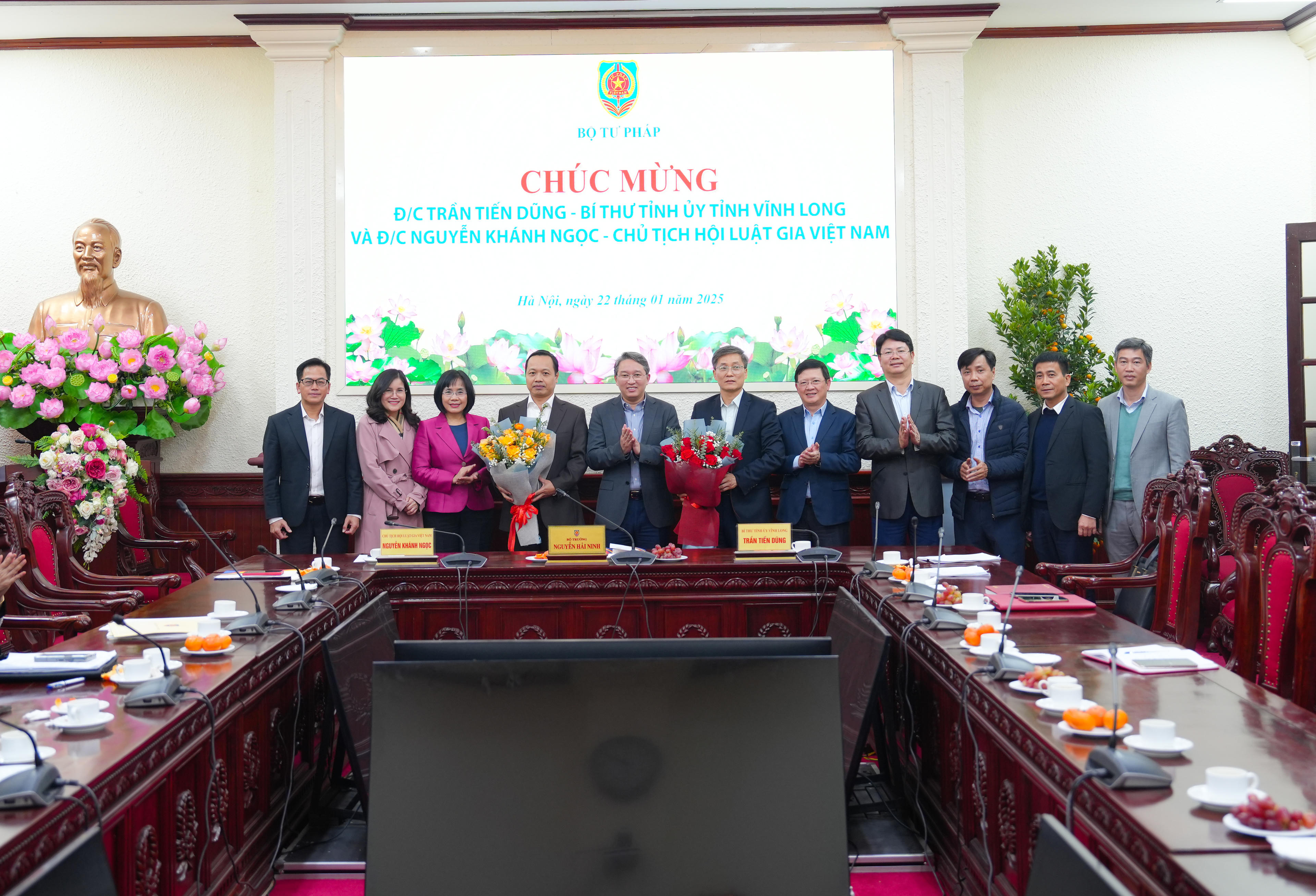 Nhân dịp này, thay mặt Ban cán sự Đảng, Lãnh đạo Bộ, Bộ trưởng Nguyễn Hải Ninh đã tặng hoa chúc mừng đồng chí Trần Tiến Dũng, Bí thư tỉnh ủy tỉnh Vĩnh Long và đồng chí Nguyễn Khánh Ngọc, Chủ tịch Hội Luật gia Việt Nam.