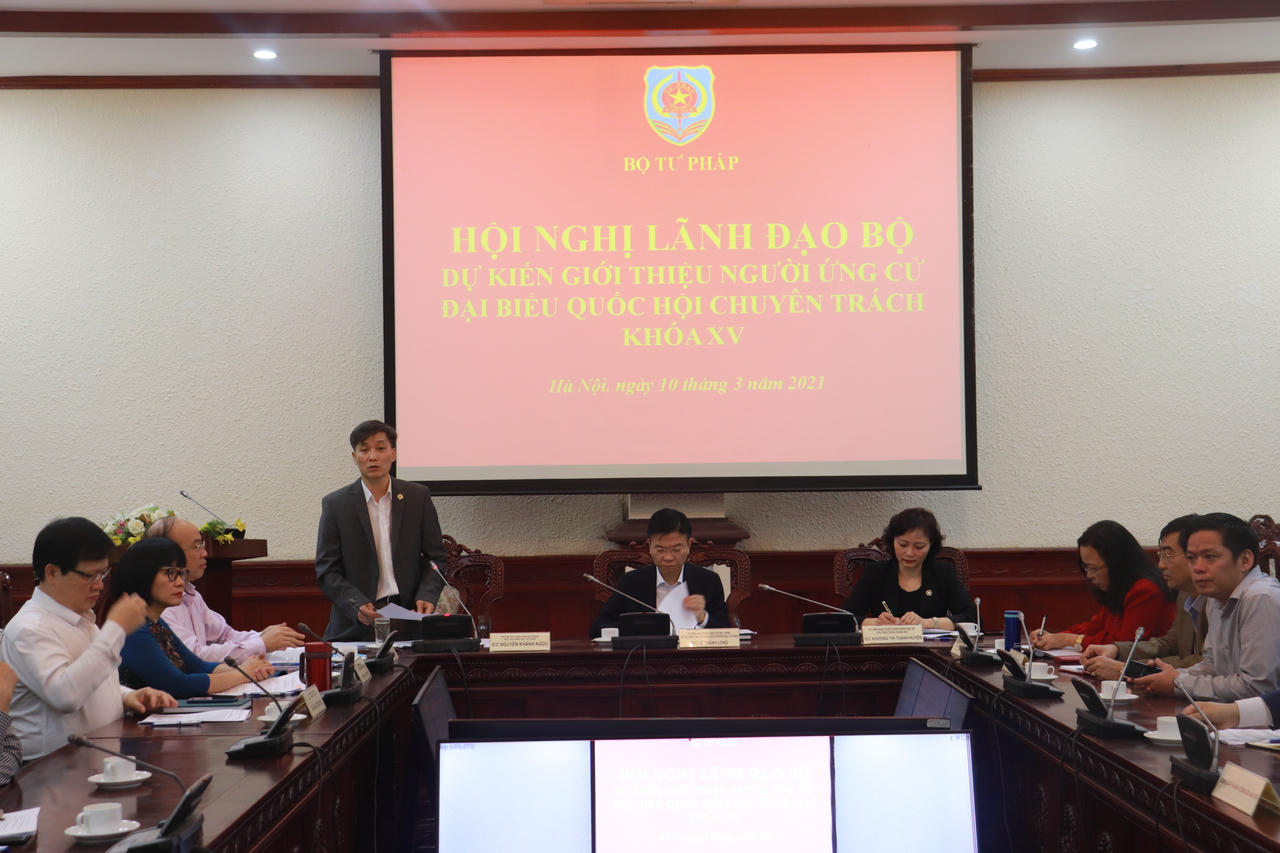 (PLVN) -Ngày 10/3, Bộ Tư pháp đã tổ chức Hội nghị Lãnh đạo Bộ dự kiến giới thiệu người ứng cử Đại biểu Quốc hội (ĐBQH) chuyên trách khóa XV; Hội nghị lấy ý kiến cử tri đối với người được giới thiệu và Hội nghị Lãnh đạo Bộ mở rộng giới thiệu người ứng cử ĐBQH chuyên trách khóa XV.