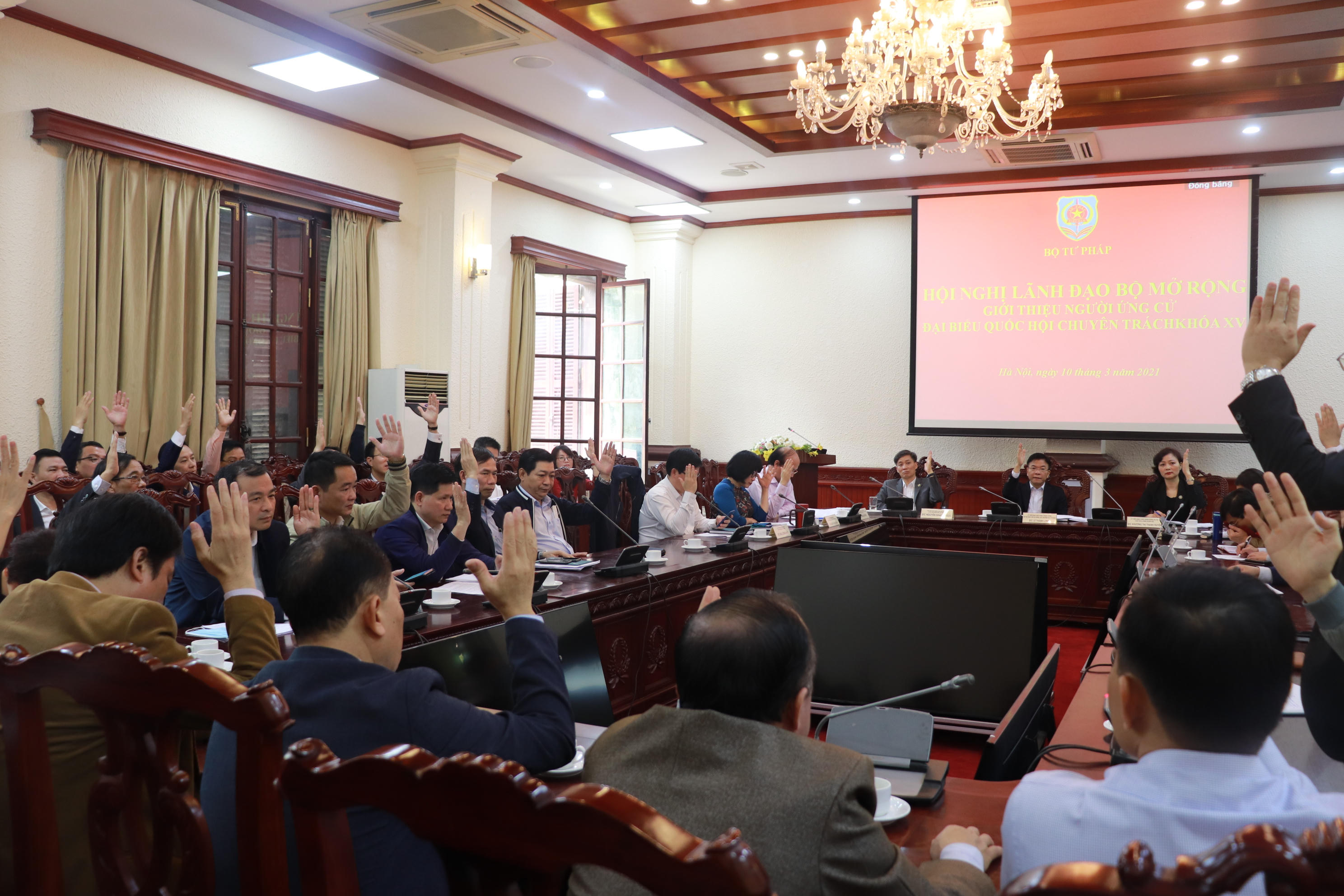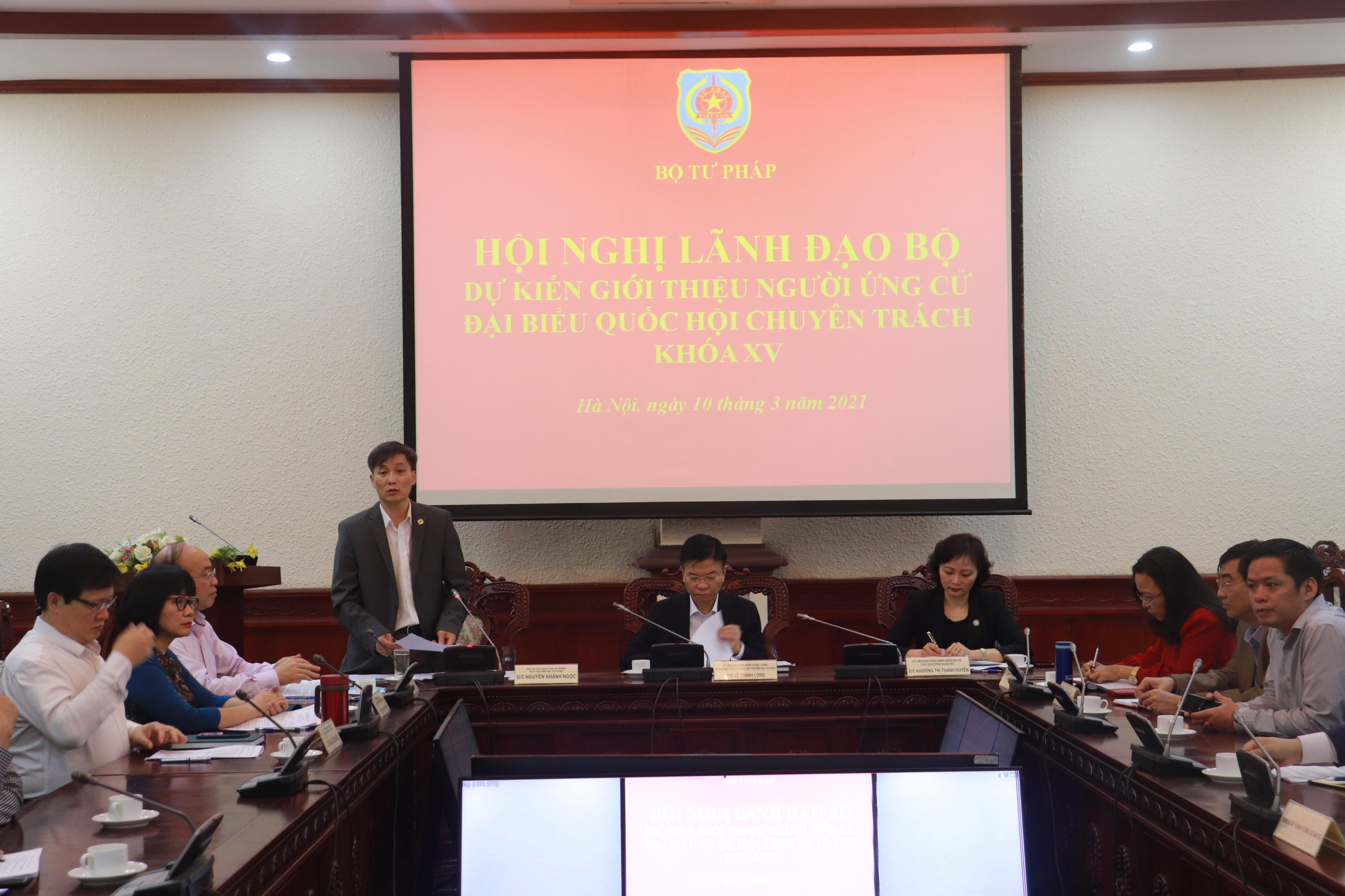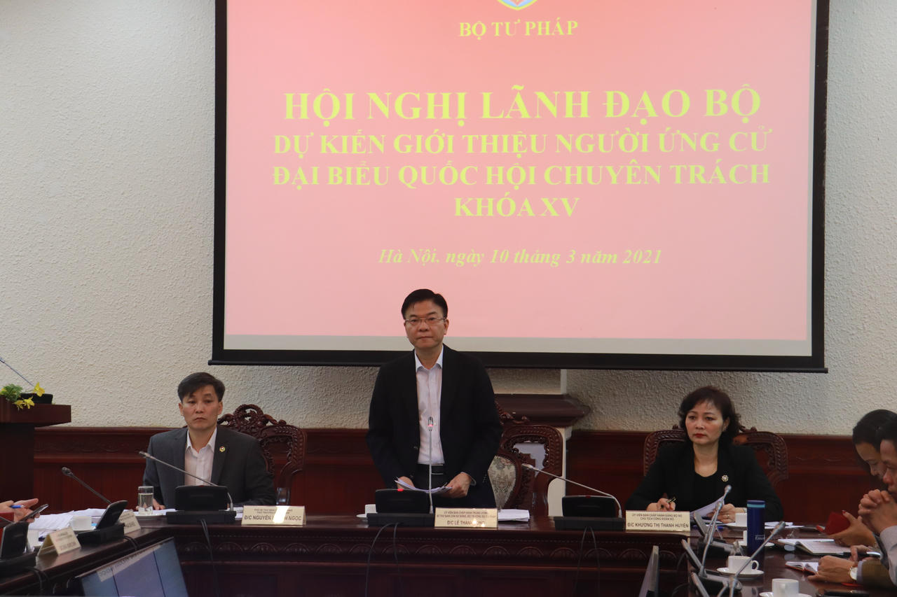 Thực hiện quy trình các bước giới thiệu người ứng cử ĐBQH chuyên trách đối với cơ quan, đơn vị, tổ chức ở Trung ương, Bộ Tư pháp đã họp, thống nhất giới thiệu các đồng chí tham gia ứng cử ĐBQH chuyên trách khóa XV bao gồm: đồng chí Đồng Ngọc Ba, Ủy viên BCH Đảng bộ Bộ, Cục trưởng Cục Kiểm tra văn bản quy phạm pháp luật; đồng chí Đỗ Đức Hiển, Ủy viên BCH Đảng bộ Bộ, Vụ trưởng Vụ Pháp luật Hình sự-Hành chính; đồng chí Bùi Mạnh Khoa, Cục trưởng Cục THADS tỉnh Thanh Hóa.
