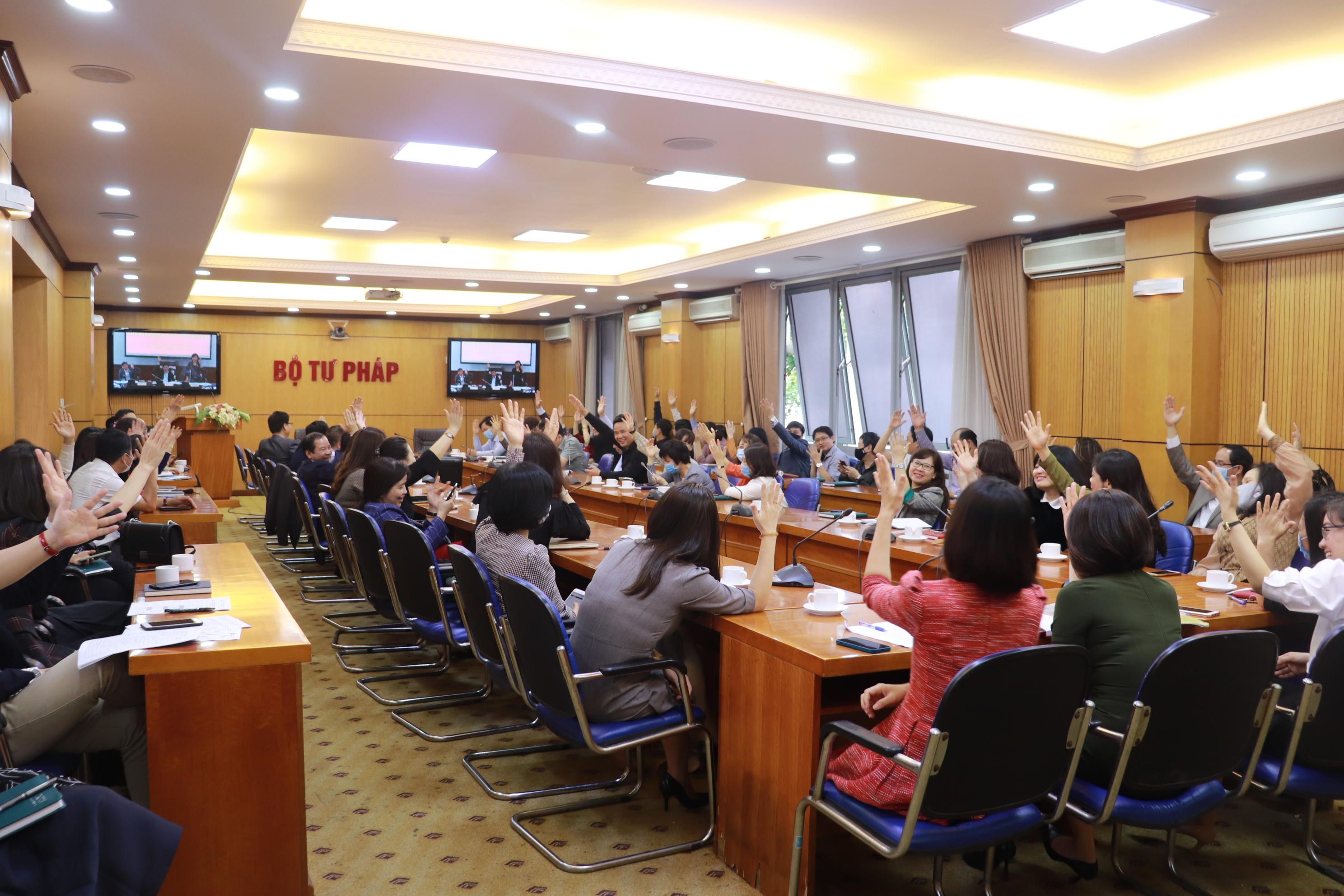 Đồng chí Lê Thành Long, Ủy viên BCH Trung ương Đảng, Bí thư Ban cán sự Đảng, Bộ trưởng Bộ Tư pháp; đồng chí Nguyễn Khánh Ngọc, Phó Bí thư Ban cán sự Đảng, Thứ trưởng Bộ Tư pháp và đồng chí Khương Thị Thanh Huyền, Ủy viên BCH Đảng bộ Bộ, Chủ tịch Công đoàn Bộ chủ trì Hội nghị.