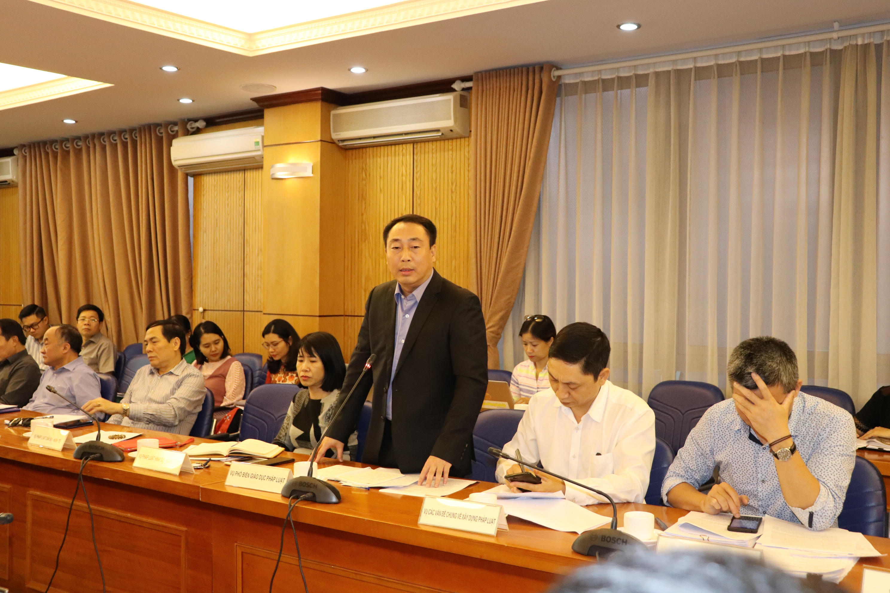 Tại cuộc họp báo, các phóng viên đã nêu câu hỏi liên quan đến các lĩnh vực quản lý của Bộ Tư pháp như công tác ban hành văn bản, thi hành án hành chính, công tác khai sinh, quốc tịch, phổ biến giáo dục pháp luật, chỉ số chi phí tuân thủ pháp luật” (chỉ số B1)…Tại cuộc họp, Vụ trưởng Vụ PBGDPL Lê Vệ Quốc, Cục trưởng Cục Hộ tịch, Quốc tịch, chứng thực, Cục trưởng Cục Quản lý xử lý VPHC và TDTHPL Đặng Thanh Sơn, Phó Cục trưởng Cục kiểm tra Văn bản Hoàng Xuân Hoan, Phó Cục trưởng Cục các vấn đề chung về xây dựng pháp luật Trần Anh Đức…đã trả lời câu hỏi của các phóng viên.