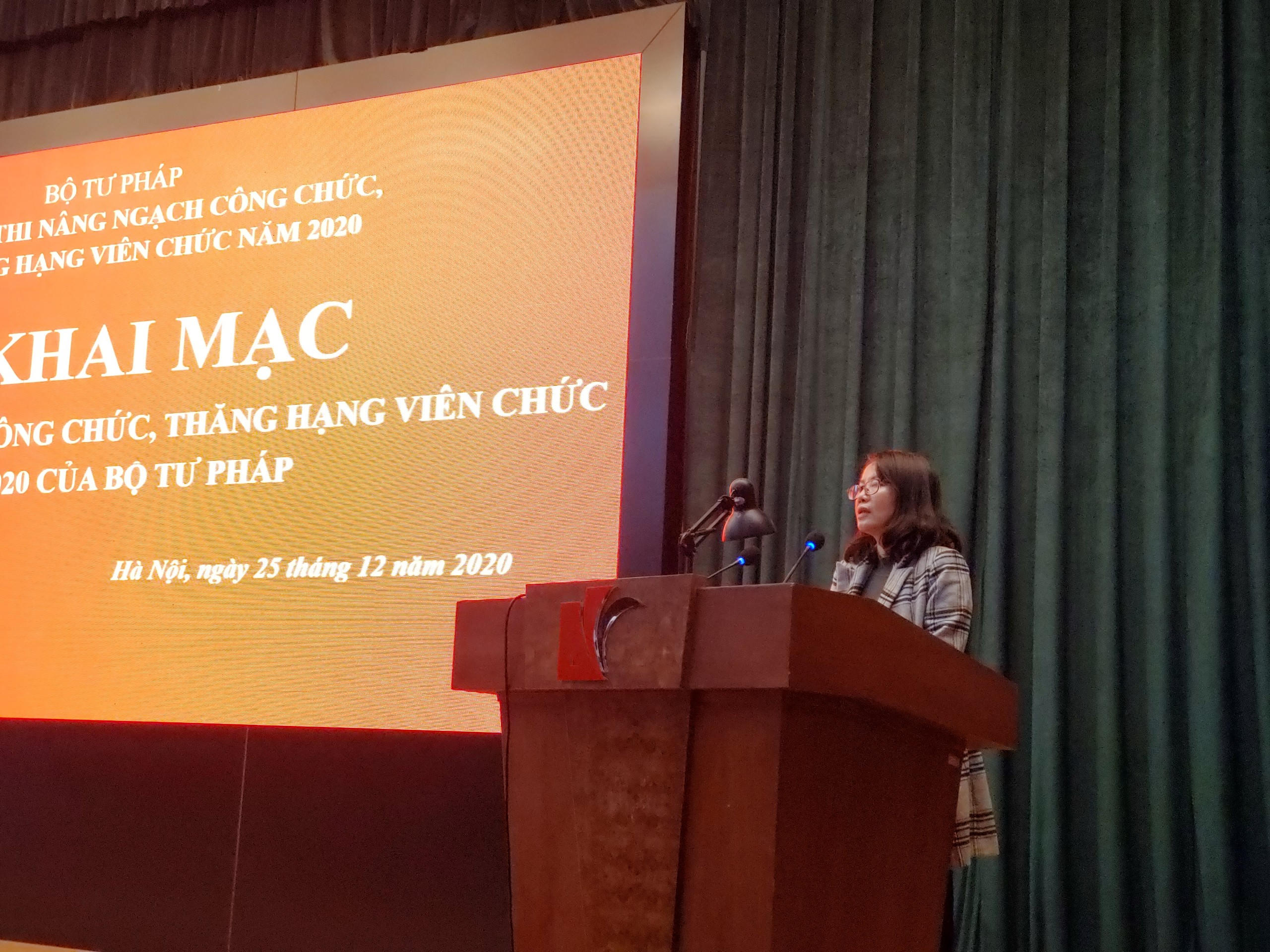 Phát biểu khai mạc kỳ thi, bà Phan Thị Hồng Hà, Quyền Vụ trưởng Vụ Tổ chức cán bộ, Bộ Tư pháp nêu rõ, “Kỳ thi nâng ngạch là một trong những bước quan trọng để từng bước chuẩn hóa và nâng cao chất lượng đội ngũ cán bộ, công chức, viên chức. Kết quả thi nâng ngạch công chức, thăng hạng viên chức cũng là cơ sở để các cơ quan, đơn vị quản lý thực hiện việc bố trí, bổ nhiệm, sử dụng cán bộ, công chức, viên chức vào các vị trí việc làm tương ứng với ngạch, chức danh nghề nghiệp cao hơn”.