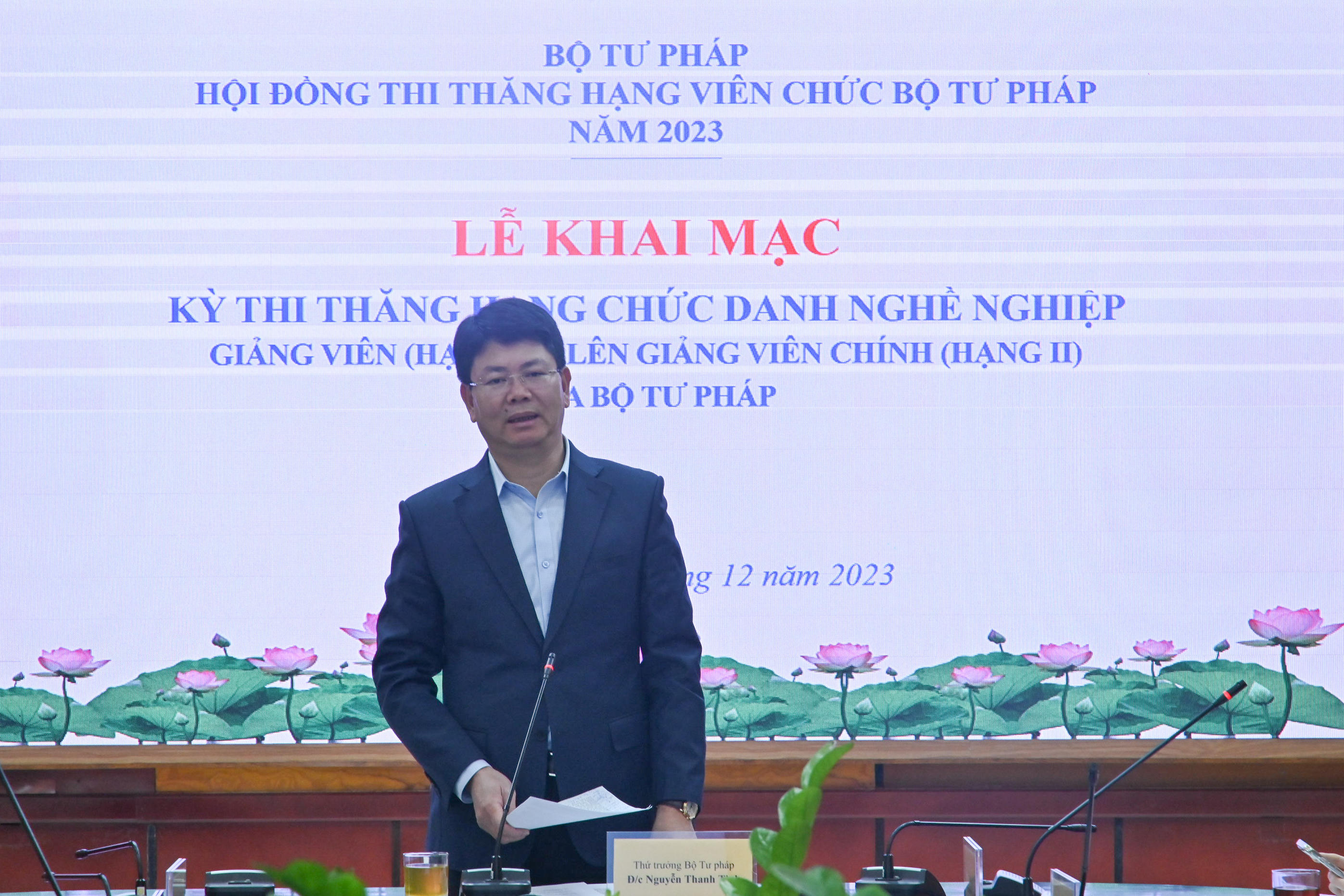 (PLVN) - Sáng 27/12, Bộ Tư pháp tổ chức Lễ Khai mạc Kỳ thi thăng hạng chức danh nghề nghiệp giảng viên (Hạng III) lên giảng viên chính (Hạng II) của Bộ. Đồng chí Nguyễn Thanh Tịnh, Uỷ viên Ban cán sự đảng, Thứ trưởng Bộ Tư pháp, Chủ tịch Hội đồng thi chủ trì buổi Lễ.