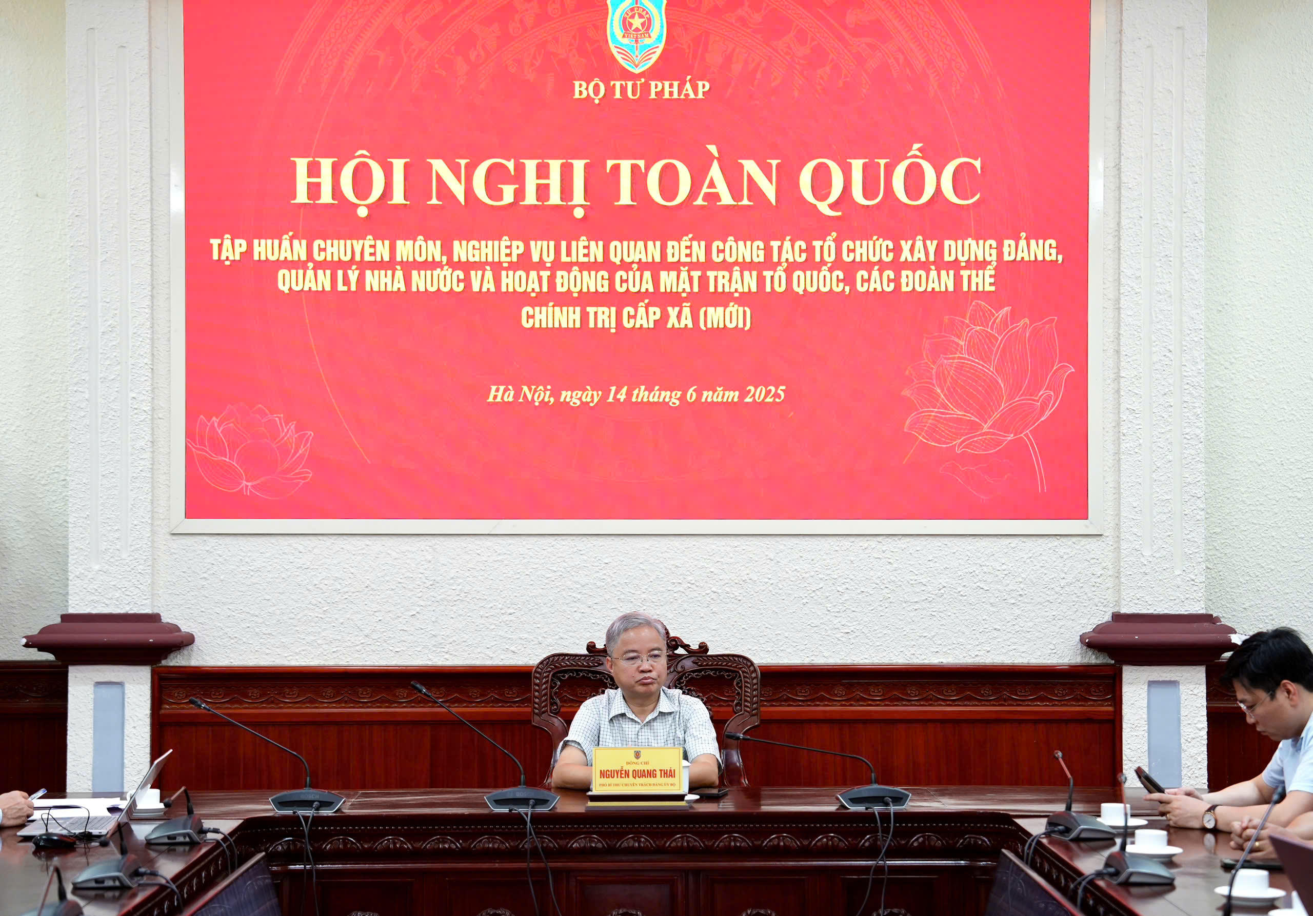 (PLVN) - Sáng 14/6, Bộ Tư pháp tổ chức điểm cầu trực tuyến Hội nghị tập huấn toàn quốc về chuyên môn nghiệp vụ liên quan đến công tác tổ chức xây dựng Đảng, quản lý nhà nước, tổ chức và hoạt động của Mặt trận Tổ quốc (MTTQ) và đoàn thể chính trị ở cấp xã (mới) do Học viện Chính trị quốc gia Hồ Chí Minh chủ trì, phối hợp tổ chức.