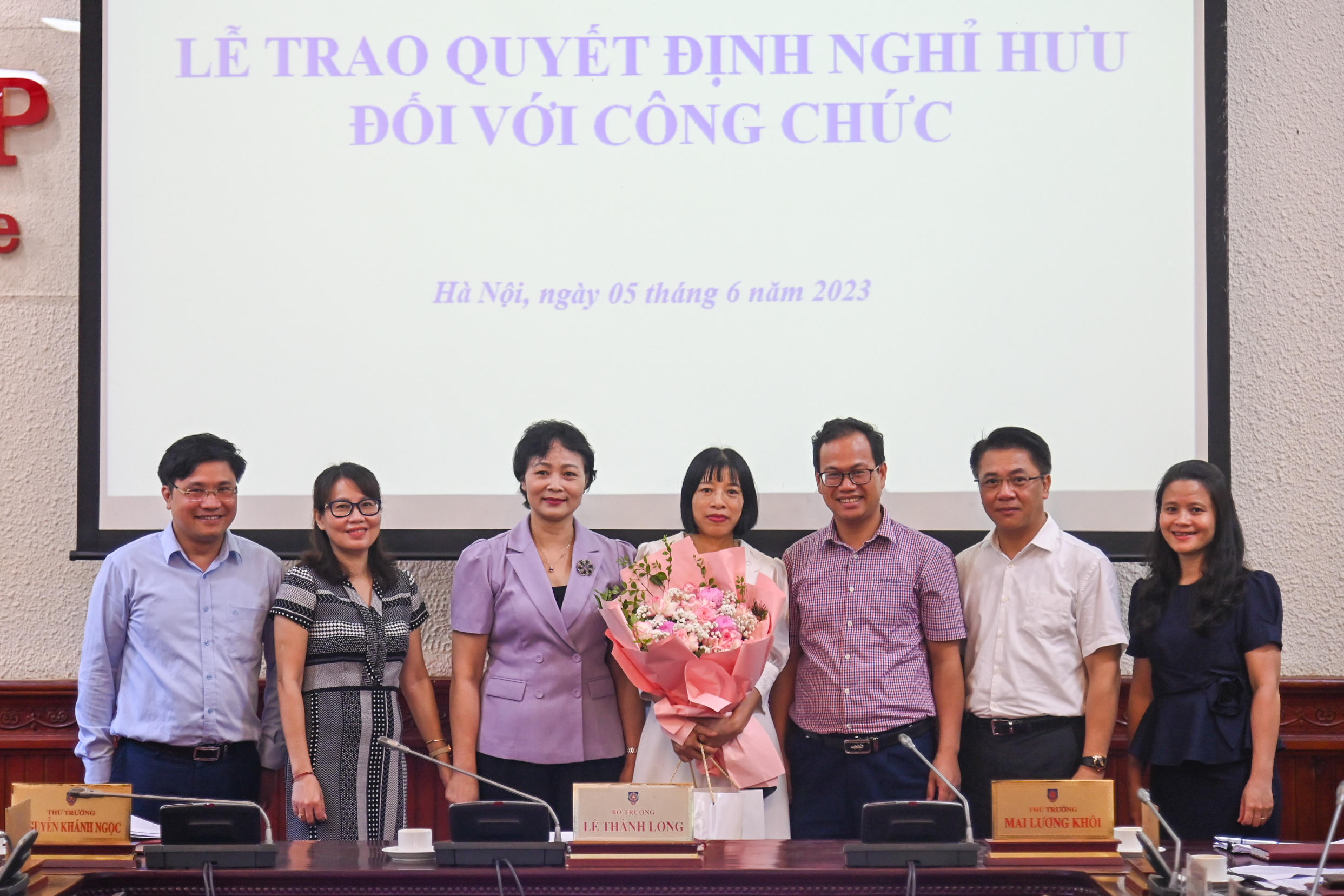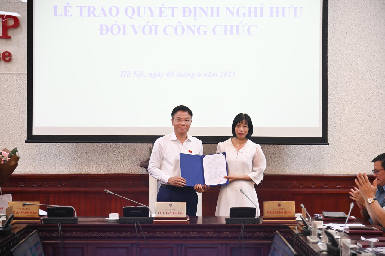 Bộ trưởng Lê Thành Long đã trao Quyết định nghỉ hưu đối với đồng chí Nguyễn Thị Mai, nguyên Phó Cục trưởng phụ trách Cục Bổ trợ tư pháp. |