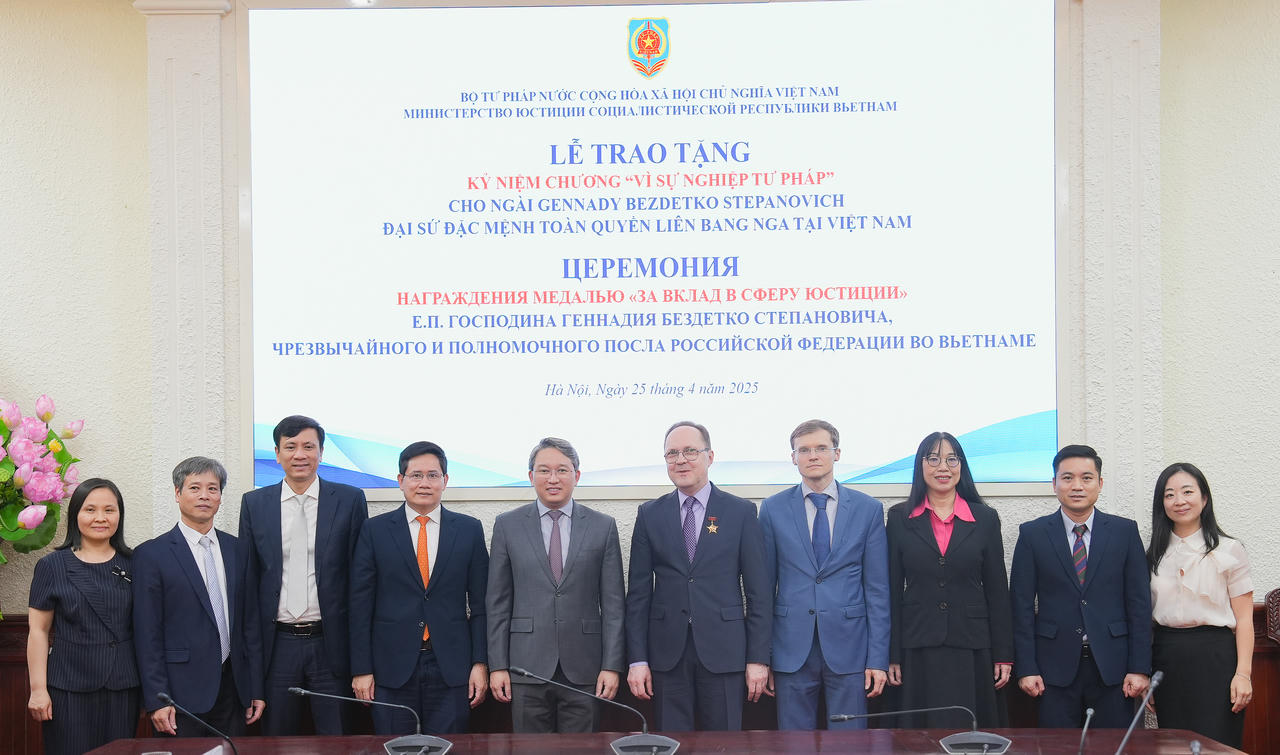 (PLVN) -Ngày 25/4, Bộ Tư pháp đã trao Kỷ niệm chương Vì sự nghiệp tư pháp cho ông Gennady Bezdetko Stepanovich, Đại sứ đặc mệnh toàn quyền Liên bang Nga tại Việt Nam. Bộ trưởng Nguyễn Hải Ninh dự và chủ trì buổi lễ.