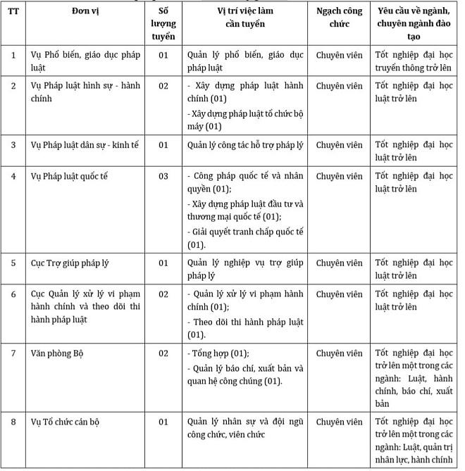 Thực hiện Kế hoạch số 204/KH-BTP ngày 25 /01/2021 của Bộ Tư pháp về việc tuyển dụng công chức theo Nghị định số 140/2017/NĐ-CP ngày 05/12/2017 của Chính phủ về chính sách thu hút, tạo nguồn cán bộ từ sinh viên tốt nghiệp xuất sắc, cán bộ khoa học trẻ, Bộ Tư pháp thông báo tuyển dụng công chức vào các đơn vị quản lý nhà nước thuộc Bộ năm 2020, gồm 13 chỉ tiêu.