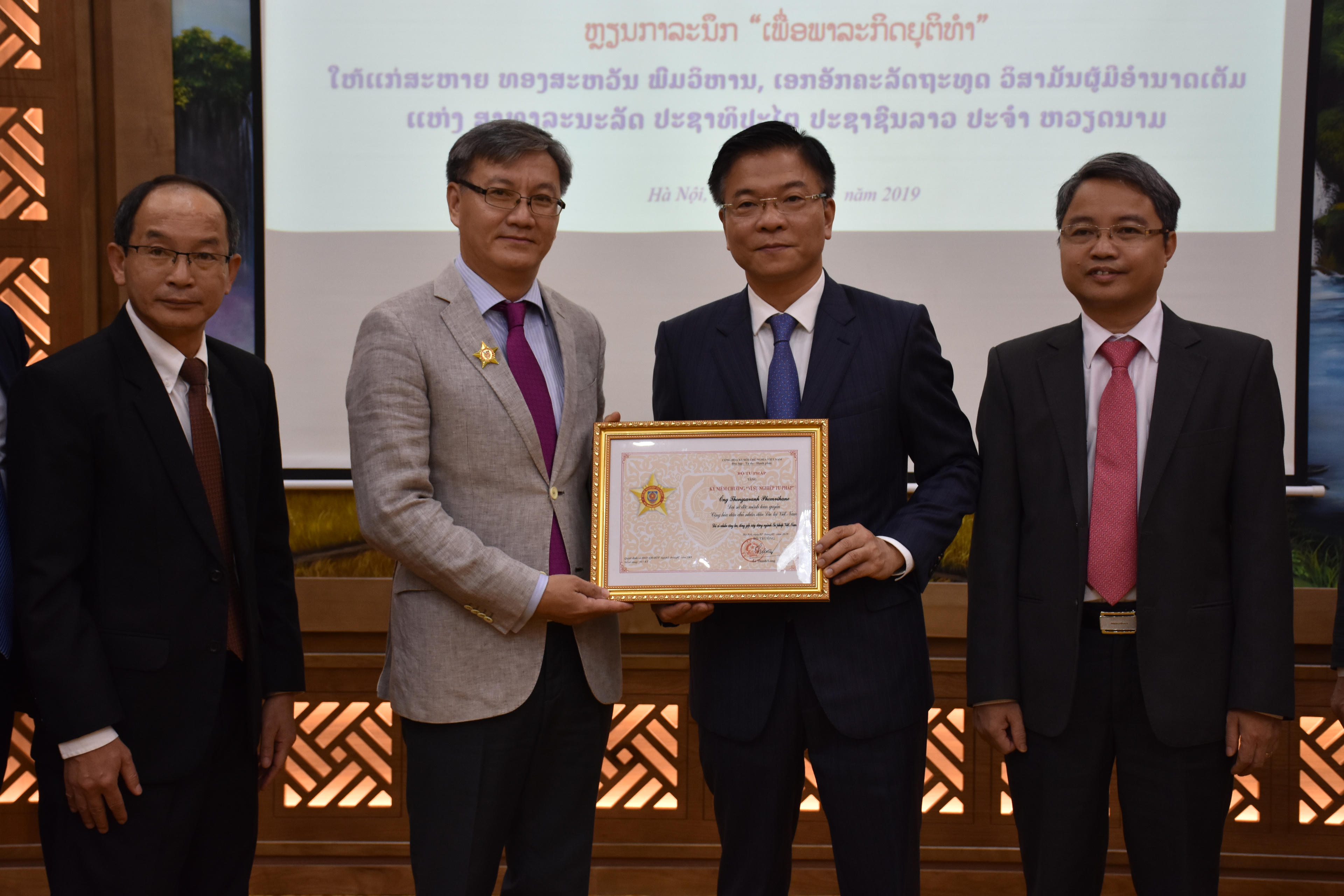 Cũng trong sáng 10/5, Bộ trưởng Lê Thành Long đã tiếp và trao Kỷ niệm chương “Vì sự nghiệp Tư pháp” cho ông Thongsavanh Phomvihane, Đại sứ đặc mệnh toàn quyền nước CHDCND Lào vì đã có nhiều công lao, đóng góp xây dựng ngành Tư pháp Việt Nam.