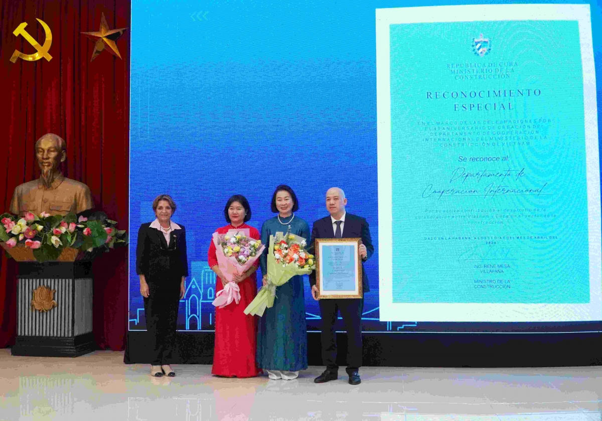 Tham tán Kinh tế Thương mại Đại sứ quán Cuba tại Việt Nam Maylem Rivero Silva thay mặt Bộ Xây dựng Cuba trao tặng Bằng khen của Bộ trưởng cho Vụ Hợp tác quốc tế.