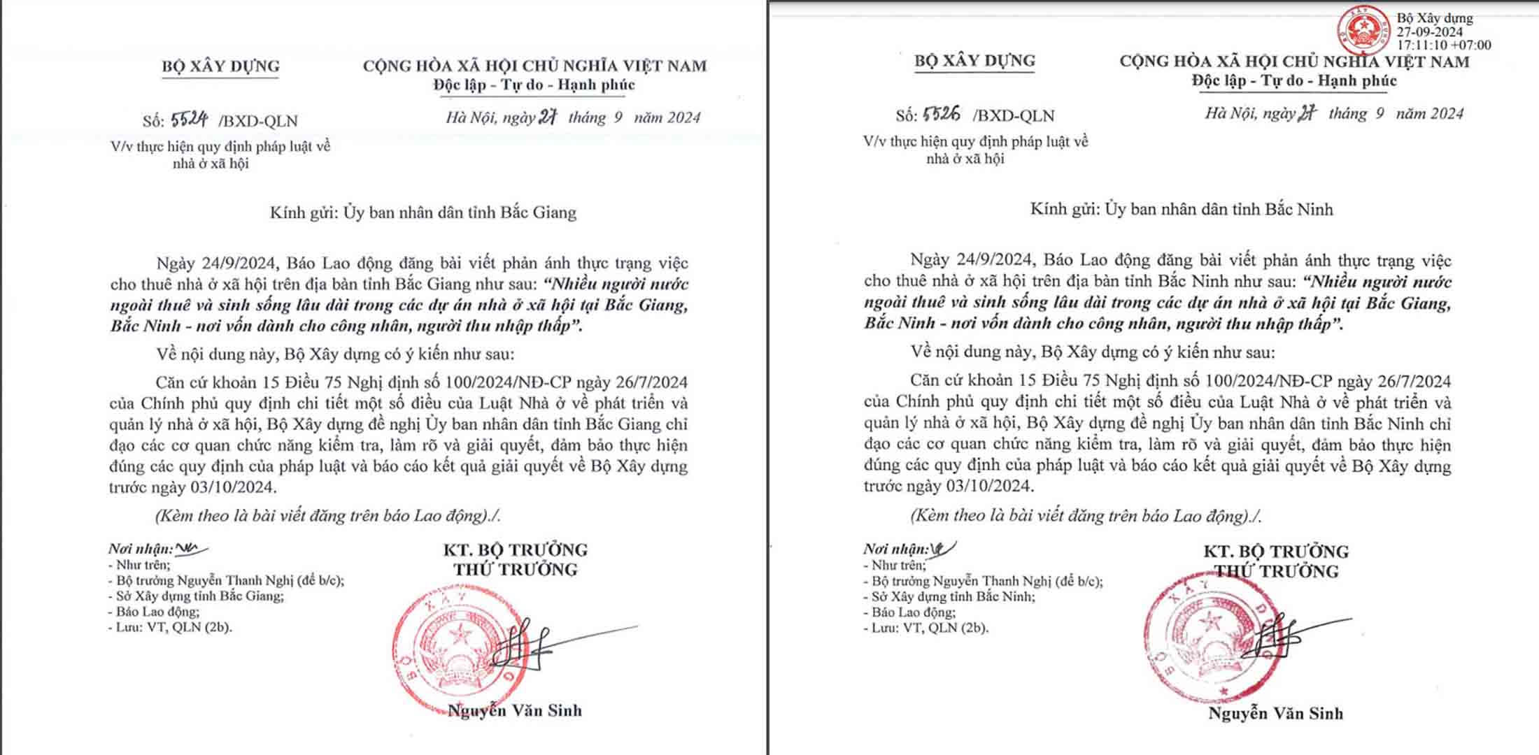 Liên quan đến vấn đề trên, Bộ Xây dựng gửi văn bản số 5524, 5526 tới UBND tỉnh Bắc Giang và UBND Bắc Ninh đề nghị kiểm tra, làm rõ và giải quyết vụ việc người nước ngoài thuê và sinh sống lâu dài trong nhà ở xã hội loại hình nhà ở ưu đãi dành cho người thu nhập thấp.