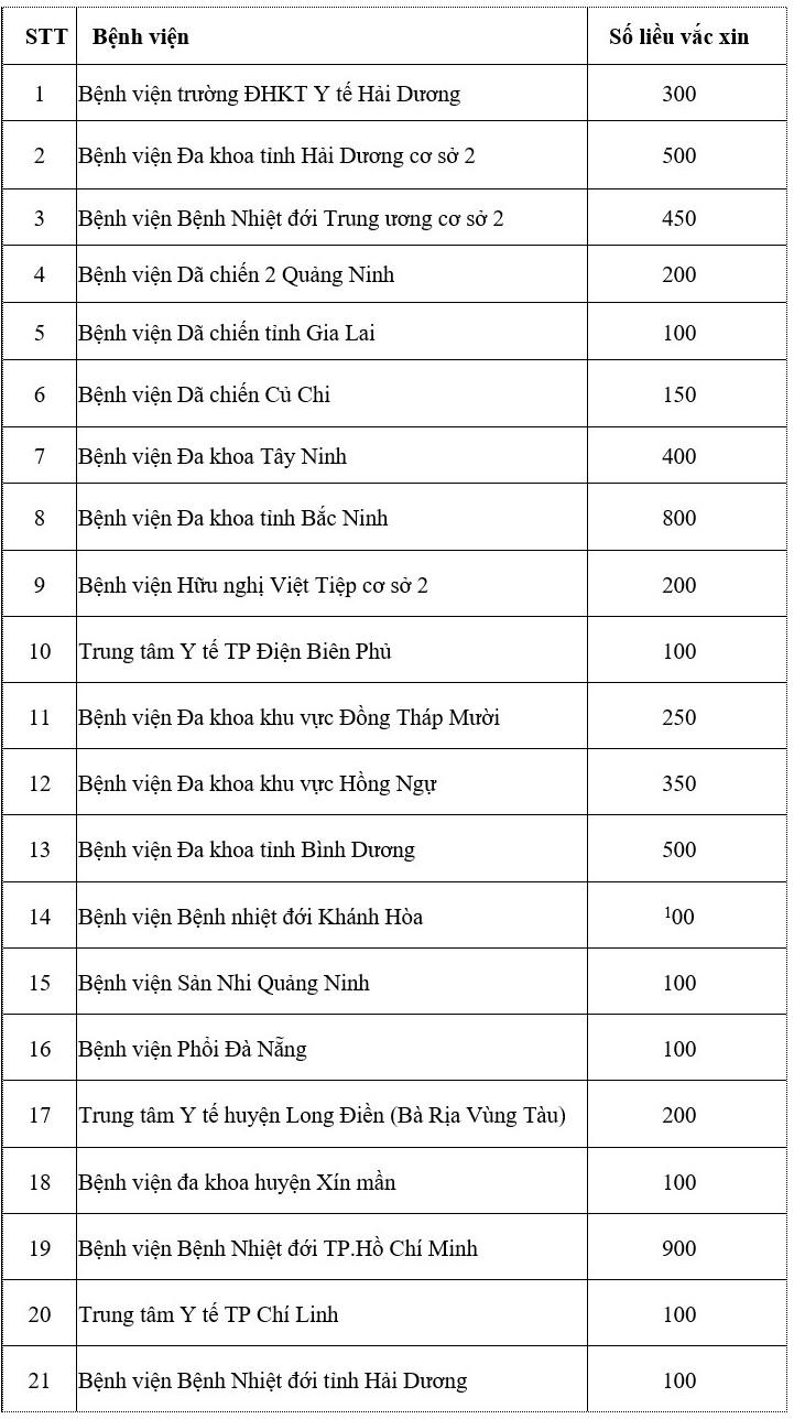 Trước đó, Bộ Y tế đã ban hành Kế hoạch tiêm vắc xin phòng Covid-19 giai đoạn 2021-2022. Có 13 tỉnh thành phố hiện đang có dịch sẽ được triển khai tiêm vắc xin Covid-19, gồm: Hà Nội, TP Hồ Chí Minh, Hải Dương, Quảng Ninh, Hải Phòng, Bắc Ninh, Bắc Giang, Hưng Yên, Hòa Bình, Gia Lai, Bình Dương, Điện Biên và Hà Giang.