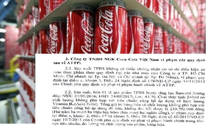 Thanh tra Bộ Y tế quyết định xử phạt Công ty Coca - Cola Việt Nam với hành vi sản xuất thực phẩm bổ sung không có giấy chứng nhận đủ điều kiện an toàn thực phẩm theo quy định tại 3 nhà máy với mức tiền là 75 triệu đồng.