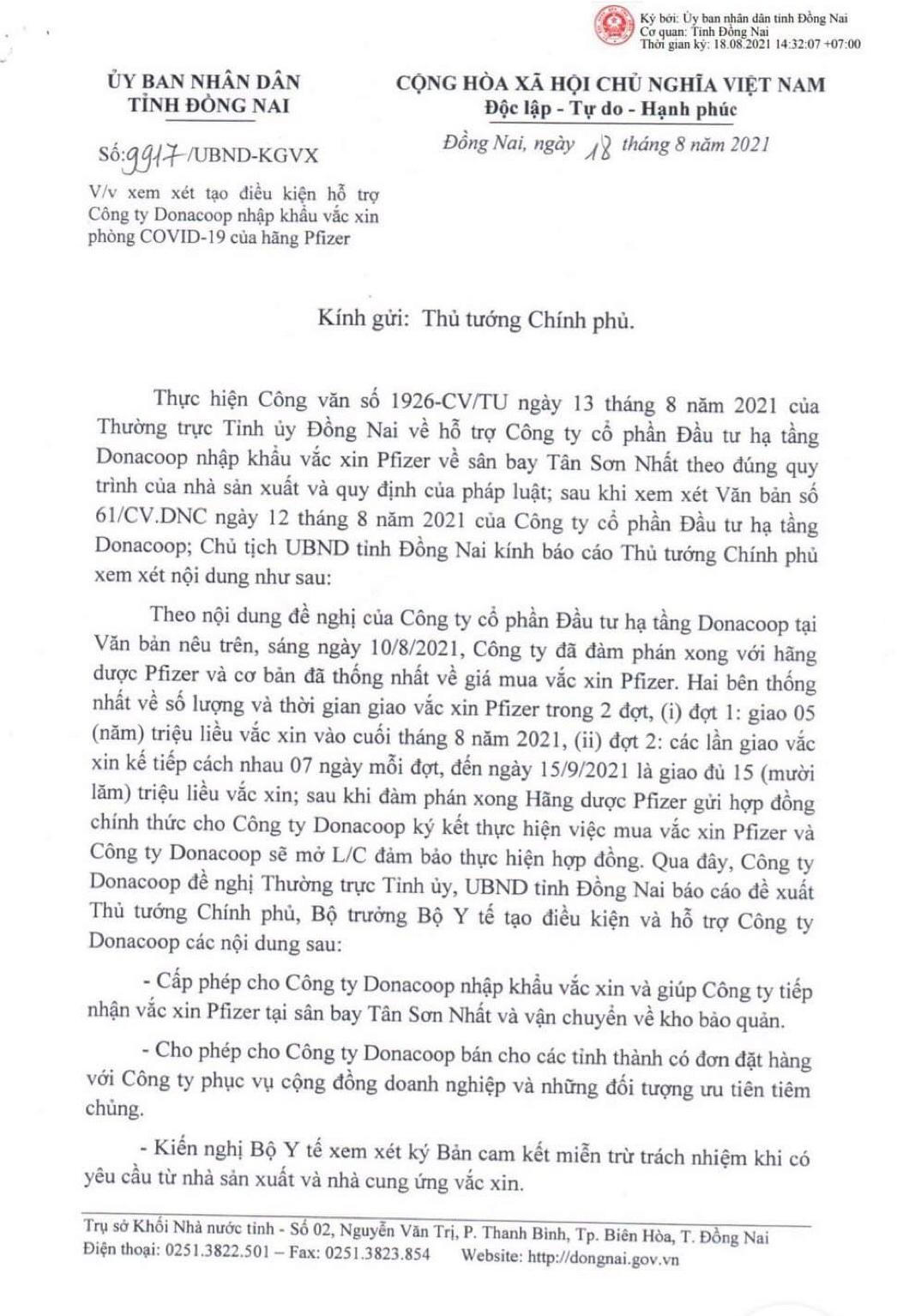Theo Báo cáo 9917/UBND-KGVX của UBND tỉnh Đồng Nai ngày 18/8/2021, ngày 12/8/2021, Cty CP đầu tư hạ tầng Donacoop có Văn bản 61/DNC gửi tỉnh.