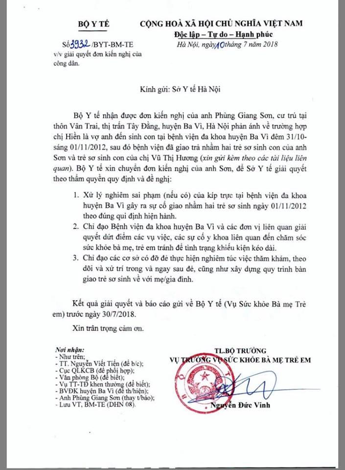 Ngay sau khi tiếp nhận đơn của anh Sơn, Bộ Y tế đã chuyển đơn đến Sở Y tế Hà Nội. Trong công văn gửi Sở Y tế TP Hà Nội, Bộ Y tế yêu cầu xử lý nghiêm sai phạm (nếu có) của kíp trực tại BVĐK huyện Ba Vì gây ra sự cố giao trả nhầm hai trẻ sơ sinh ngày 1/11/2012 theo đúng quy định hiện hành. Bên cạnh đó, Sở Y tế Hà Nội chỉ đạo BVĐK Ba Vì và các đơn vị liên quan phải giải quyết dứt điểm vụ việc, các sự cố y khoa liên quan đến chăm sóc sức khỏe bà mẹm trẻ em để tránh tình trạng khiếu kiện kéo dài.
