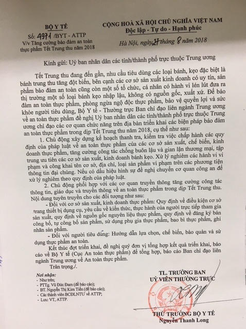 (PLO) - Bộ Y tế vừa có Công văn số 4971/BYT-ATTP gửi UBND các tỉnh/thành phố trực thuộc Trung ương, yêu cầu tăng cường bảo đảm an toàn thực phẩm Tết trung thu năm 2018.