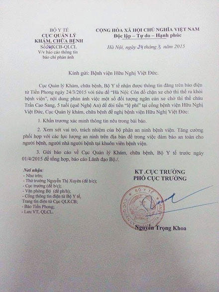 Công văn của Cục Quản lý Khám, chữa bệnh đề nghị Bệnh viện Hữu nghị Việt Đức khẩn trương xác minh thông tin nêu trong bài báo, đồng thời xem xét vai trò, trách nhiệm của bộ phận an ninh trong bệnh viện.