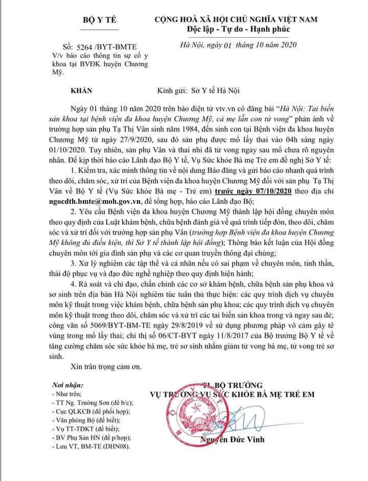 Vụ Sức khỏe Bà mẹ - Trẻ em đề nghị Sở Y tế kiểm tra, xác minh thông tin về nội dung báo đăng và gửi báo cáo nhanh quá trình theo dõi, chăm sóc, xử trí của BVĐK huyện Chương Mỹ đối với sản phụ T.T.V về Bộ Y tế trước ngày 7/10/2020.